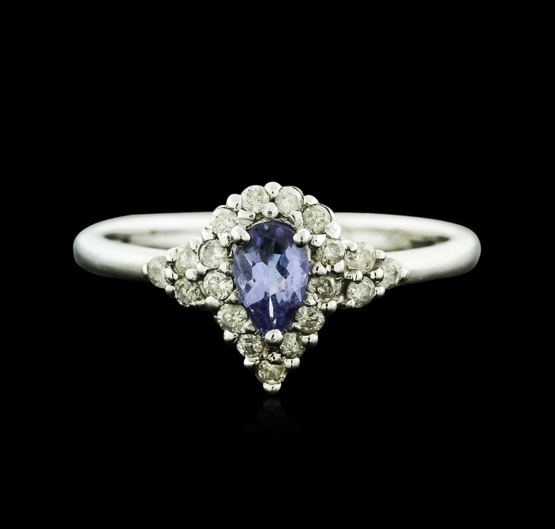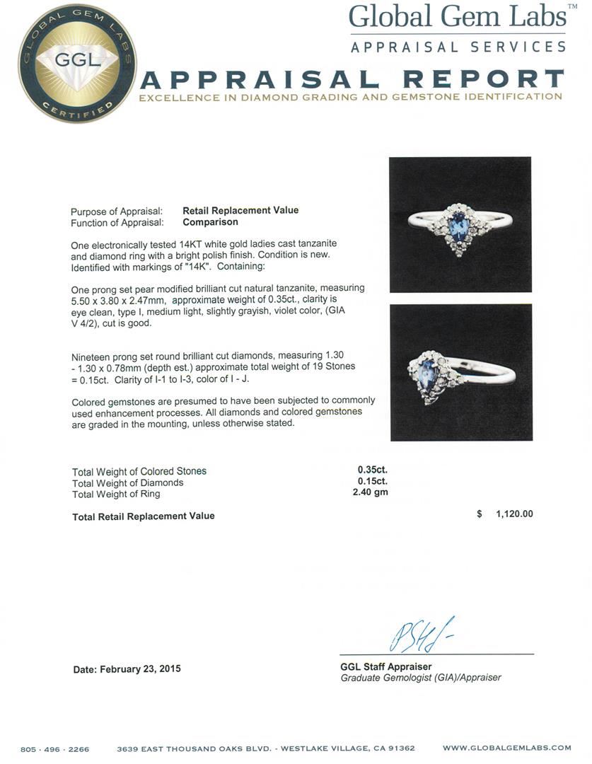 One electronically tested 14KT white gold ladies cast tanzanite and diamond ring with a bright polish finish. Identified with markings of "14K". Condition is new. Containing: One prong set pear modified brilliant cut natural tanzanite, measuring 5.50 x 3.80 x 2.47mm, approximate weight of 0.35ct., clarity is eye clean, type I, medium light, slightly grayish, violet color, (GIA V 4/2), cut is good. Nineteen prong set round brilliant cut diamonds, measuring 1.30 - 1.30 x 0.78mm (depth est.) approximate total weight of 19 Stones = 0.15ct. Clarity: I-1 to I-3. Color: I - J. Colored gemstones are presumed to have been subjected to commonly used enhancement processes. All diamonds and colored gemstones are graded in the mounting, unless otherwise stated. Total Weight of Colored Stones 0.35ct. Total Weight of Diamonds 0.15ct. Total Weight of Ring 2.40 grams. GGL Appraised at $1,120.00.