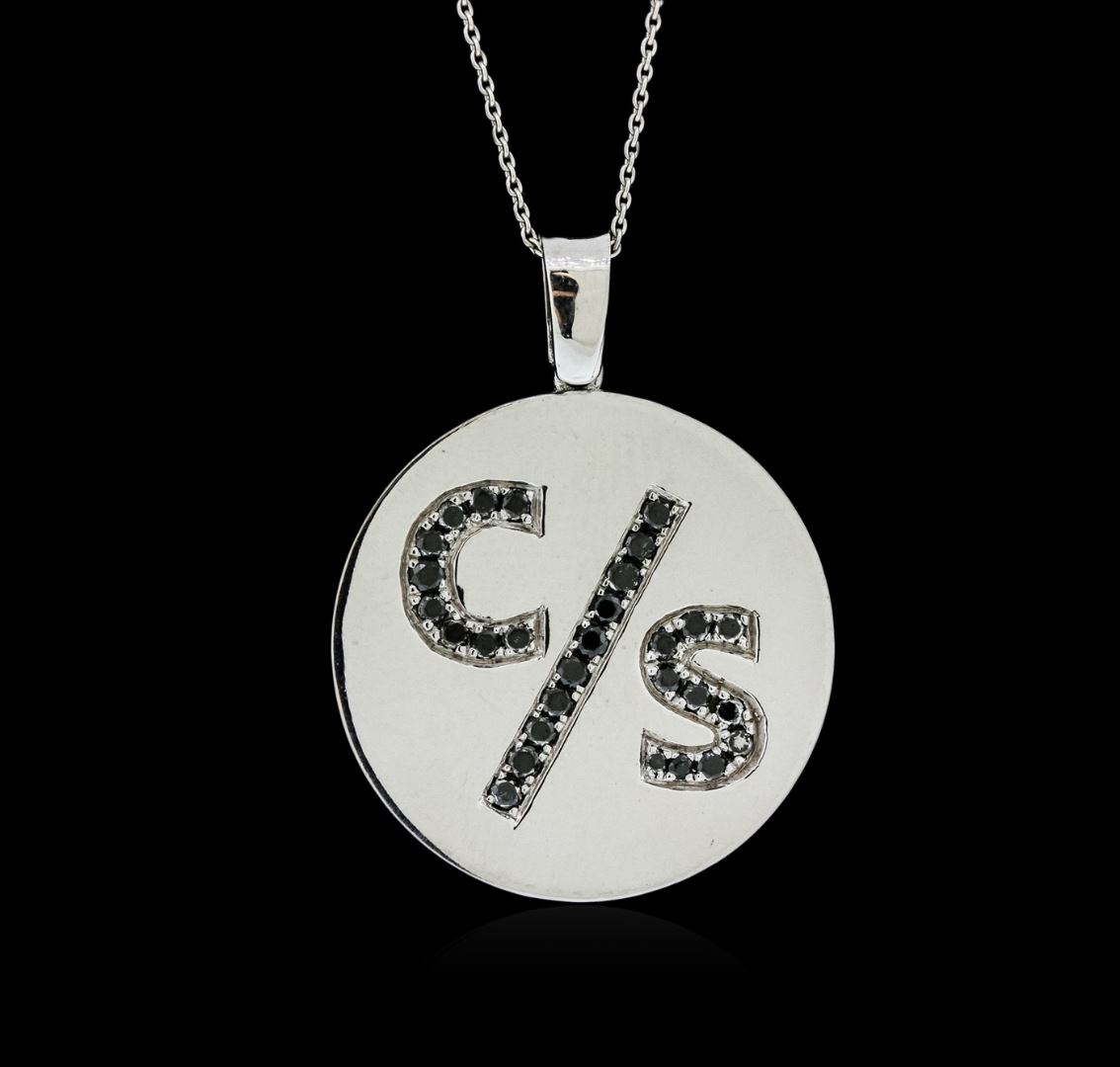 One coin style pendant with chain featuring: 14KT white gold weighing 6.40 grams containing pave set round black diamonds with a total weight of 0.35ct.