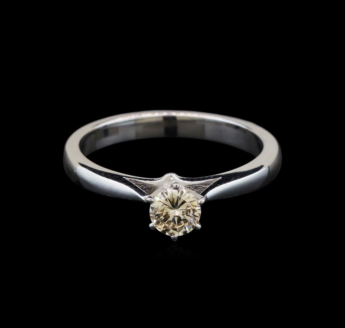 One electronically tested 14KT white gold ladies cast diamond solitaire ring with a flat shank with a bright polish finish. Identified with markings of "14K". Condition is new. Containing: One prong set round brilliant cut diamond, measuring 4.80 - 4.80 x 2.88mm (depth est.) exact weight 0.36ct. Clarity: SI-2, Cut is Good. Diamonds are graded in the mounting, unless otherwise stated. Total Weight of Diamonds 0.36ct. Total Weight of Solitaire Ring 3.00 grams. GGL Appraised at $1,055.00.