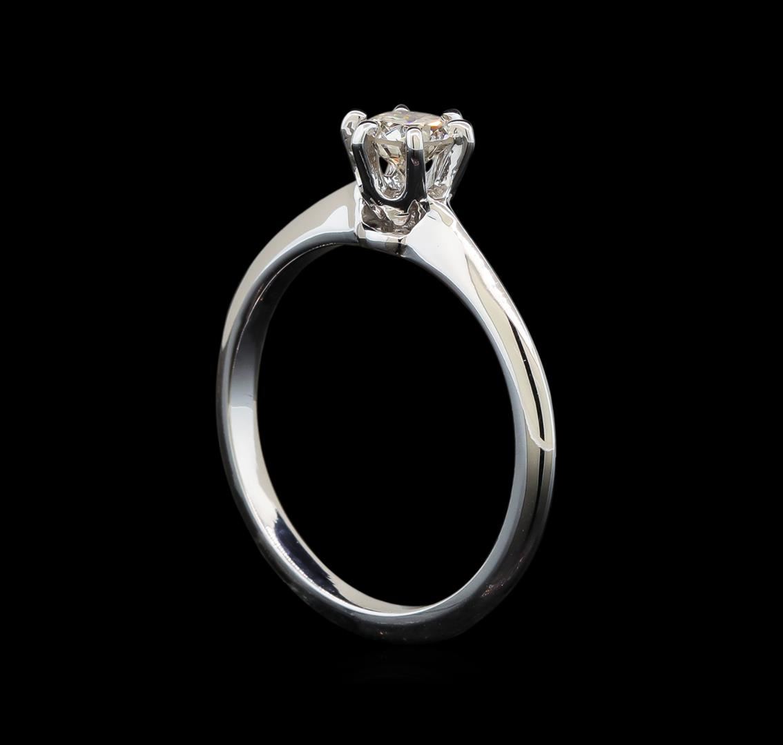 One electronically tested 14KT white gold ladies cast diamond solitaire ring with a knife edge shank with a bright polish finish. Identified with markings of "14K". Condition is new. Containing: One prong set round brilliant cut diamond, measuring 4.90 - 4.60 x 2.85mm (depth est.) exact weight 0.37ct. Clarity: SI-2. Color: K, Cut is Good. Diamonds are graded in the mounting, unless otherwise stated. Total Weight of Diamonds 0.37ct. Total Weight of Solitaire Ring 2.20 grams. GGL Appraised at $1,360.00.