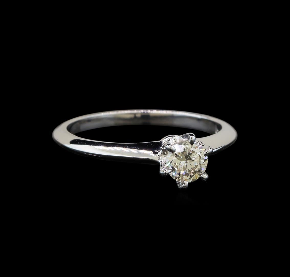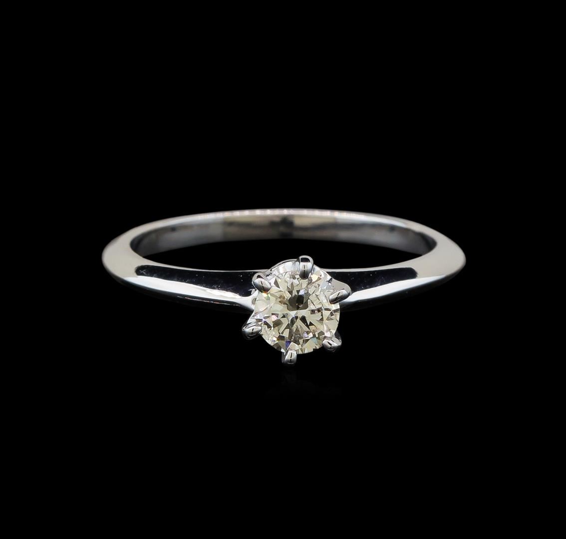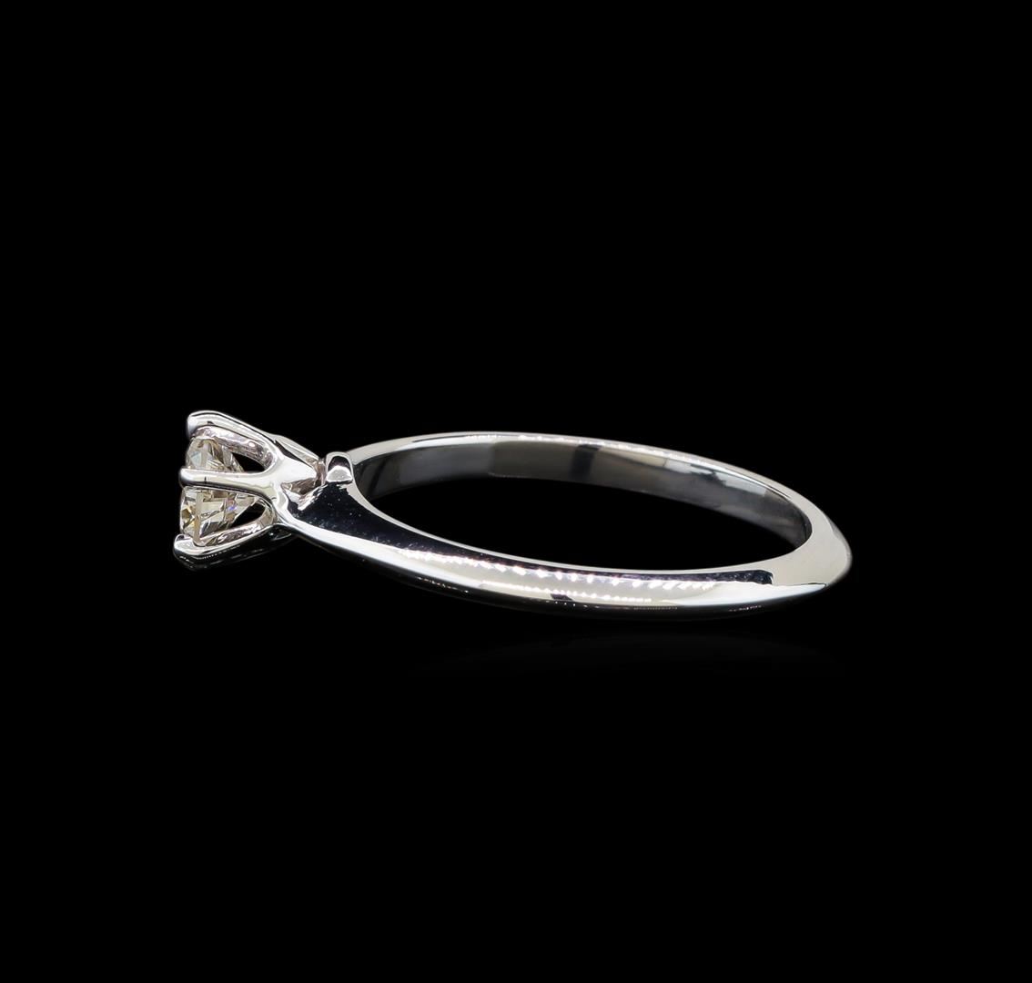 One electronically tested 14KT white gold ladies cast diamond solitaire ring with a knife edge shank with a bright polish finish. Identified with markings of "14K". Condition is new. Containing: One prong set round brilliant cut diamond, measuring 4.90 - 4.60 x 2.85mm (depth est.) exact weight 0.37ct. Clarity: SI-2. Color: K, Cut is Good. Diamonds are graded in the mounting, unless otherwise stated. Total Weight of Diamonds 0.37ct. Total Weight of Solitaire Ring 2.20 grams. GGL Appraised at $1,360.00.