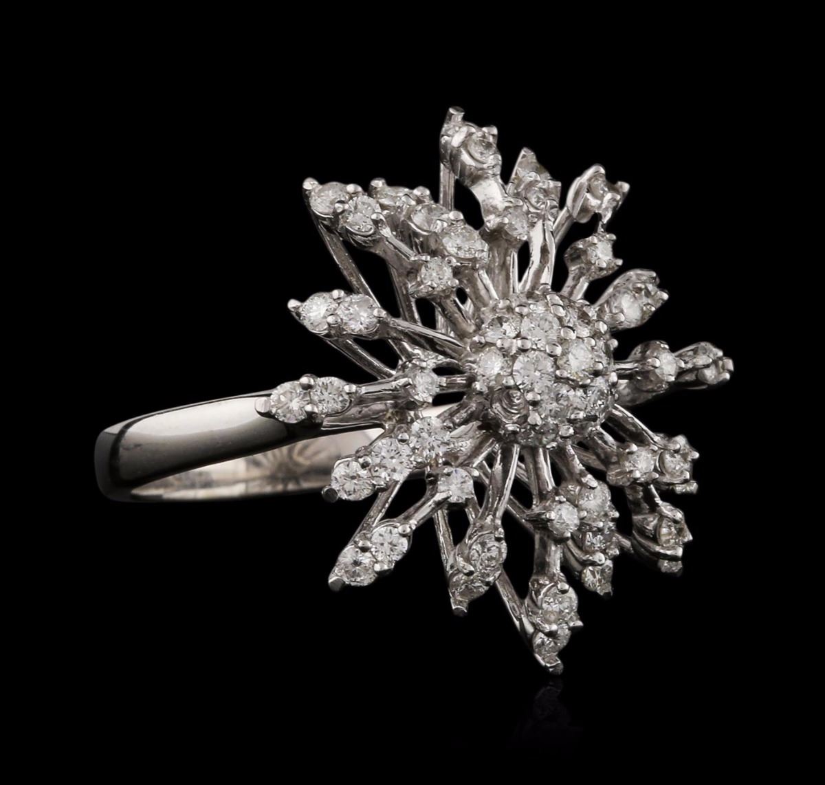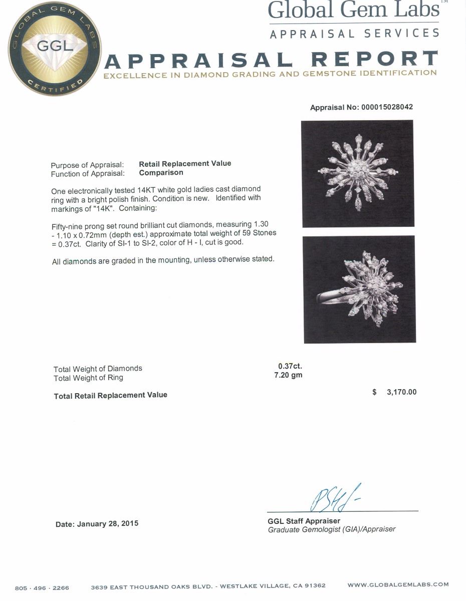 One electronically tested 14KT white gold ladies cast diamond ring with a bright polish finish. Identified with markings of "14K". Condition is new. Containing: Fifty-Nine prong set round brilliant cut diamonds, measuring 1.30 - 1.10 x 0.72mm (depth est.) approximate total weight of 59 Stones = 0.37ct. Clarity: SI-1 to SI-2. Color: H - I, Cut is Good. All diamonds are graded in the mounting, unless otherwise stated. Total Weight of Diamonds 0.37ct. Total Weight of Ring 7.20 grams. GGL Appraised at $3,170.00.