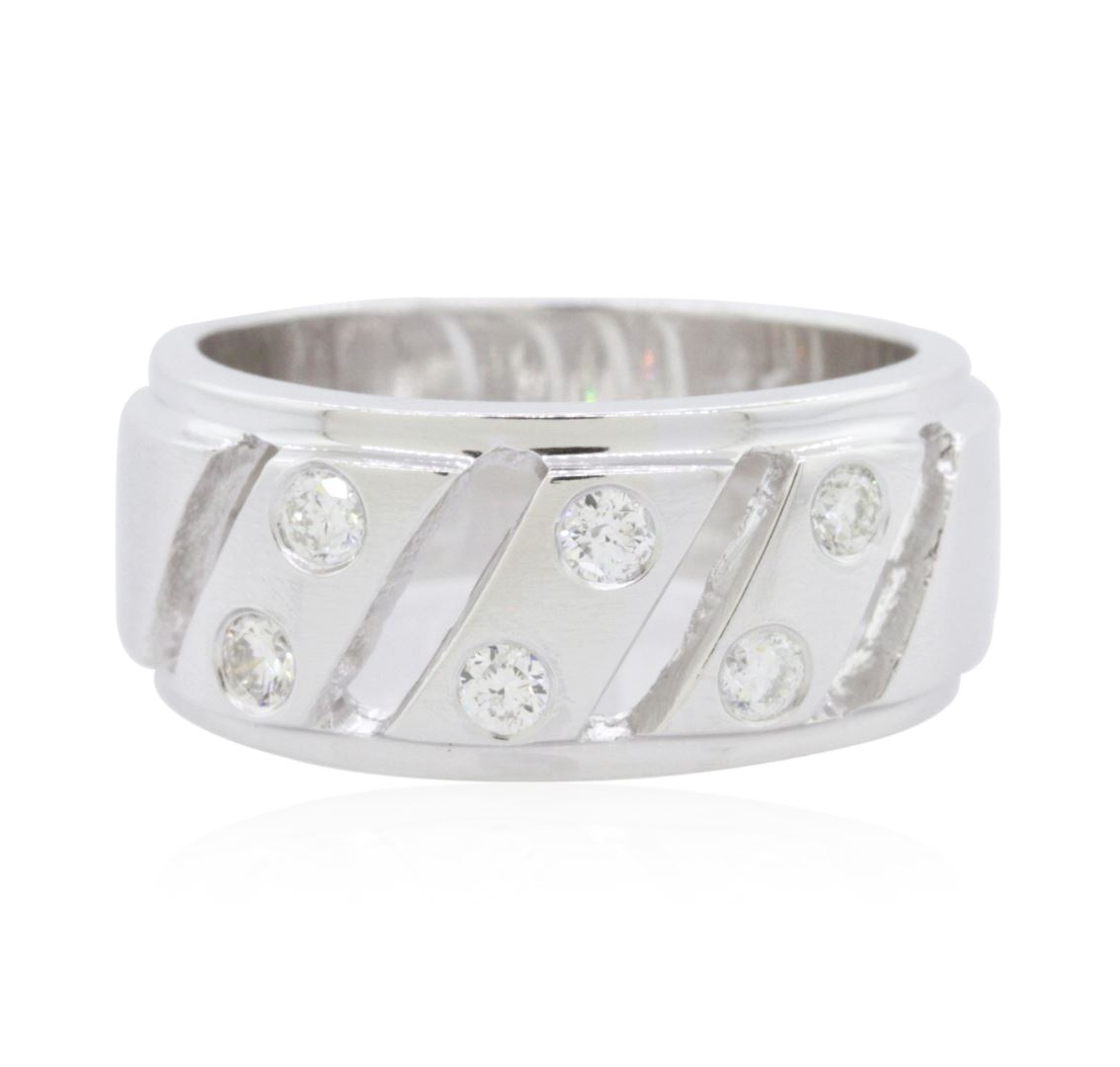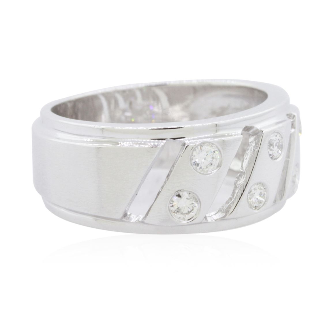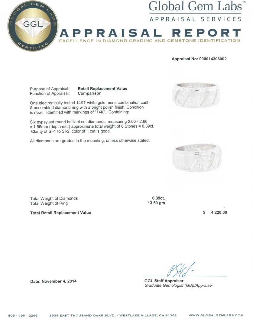 One electronically tested 14KT white gold mens combination cast & assembled diamond ring with a bright polish finish. Identified with markings of "14K". Condition is new. Containing: Six gypsy set round brilliant cut diamonds, measuring 2.60 - 2.60 x 1.56mm (depth est.) approximate total weight of 6 Stones = 0.39ct. Clarity: SI-1 to SI-2. Color: I, Cut is Good. All diamonds are graded in the mounting, unless otherwise stated. Total Weight of Diamonds 0.39ct. Total Weight of Ring 13.50 grams. GGL Appraised at $4,220.00.