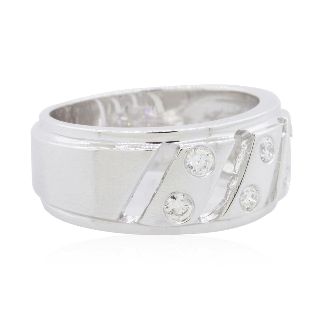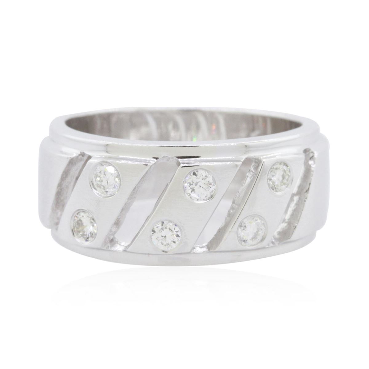 One electronically tested 14KT white gold mens combination cast & assembled diamond ring with a bright polish finish. Identified with markings of "14K". Condition is new. Containing: Six gypsy set round brilliant cut diamonds, measuring 2.60 - 2.60 x 1.56mm (depth est.) approximate total weight of 6 Stones = 0.39ct. Clarity: SI-1 to SI-2. Color: I, Cut is Good. All diamonds are graded in the mounting, unless otherwise stated. Total Weight of Diamonds 0.39ct. Total Weight of Ring 13.50 grams. GGL Appraised at $4,220.00.
