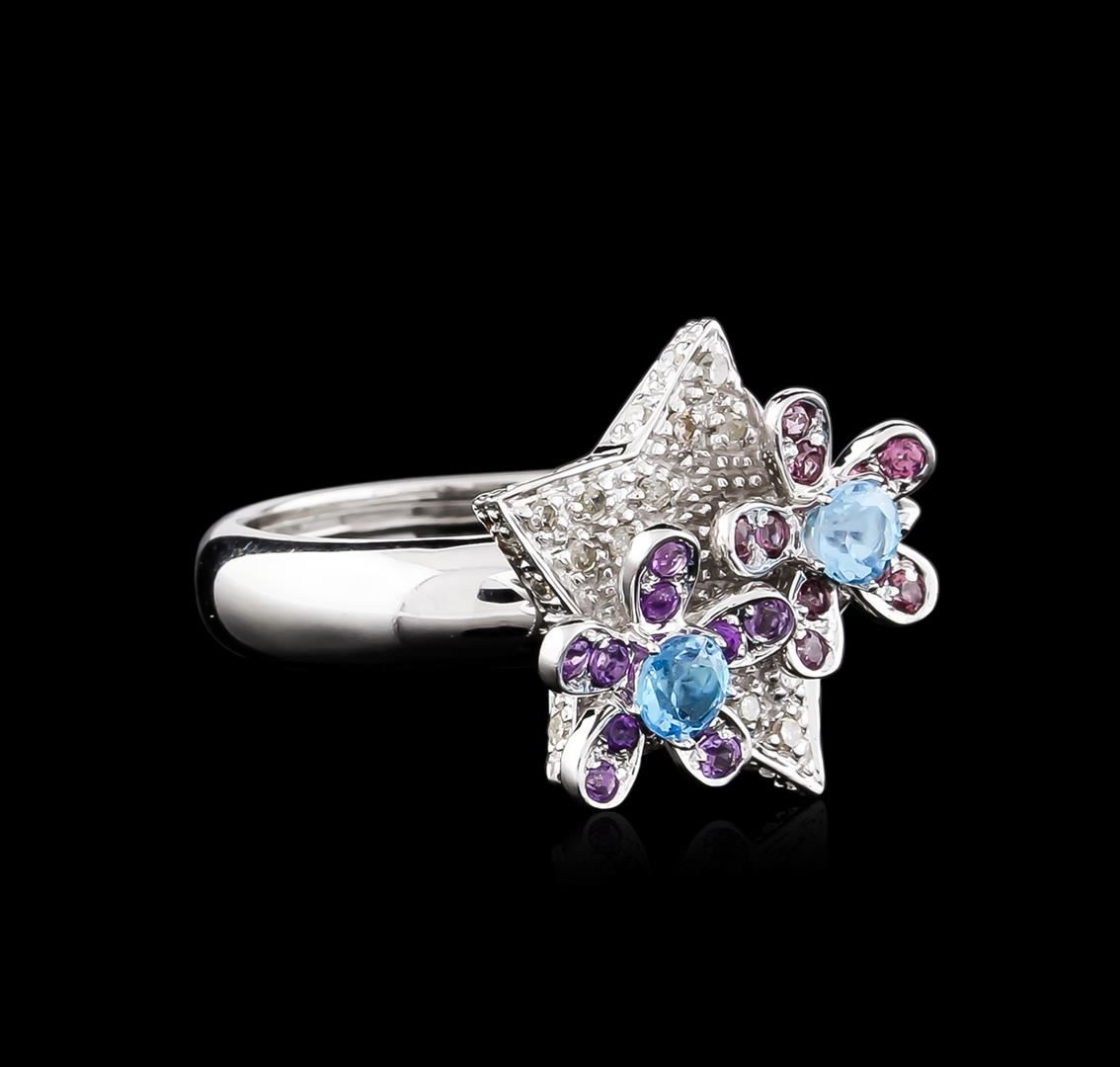 One ring featuring: 14KT white gold weighing 6.89 grams containing amethysts with a total weight of 0.40ct, blue topazes with a total weight of 0.30ct and diamonds with a total weight of 0.30ct.