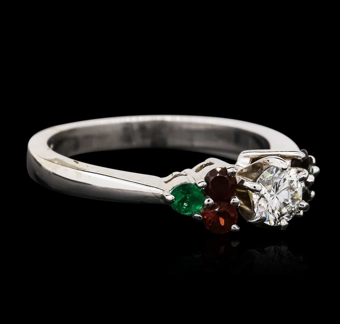 One ring featuring: 14KT white gold weighing 4.50 grams containing one round diamond center stone with a total weight of 0.40ct, four garnets with a total weight of 0.28cts, and two emeralds with a total weight of 0.14cts.