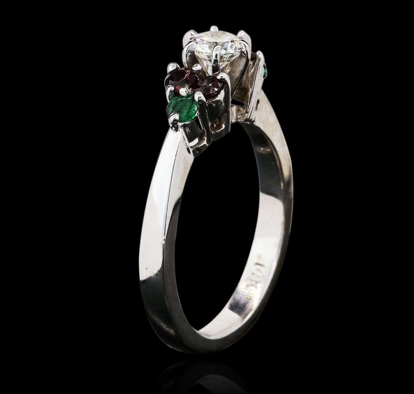 One ring featuring: 14KT white gold weighing 4.50 grams containing one round diamond center stone with a total weight of 0.40ct, four garnets with a total weight of 0.28cts, and two emeralds with a total weight of 0.14cts.