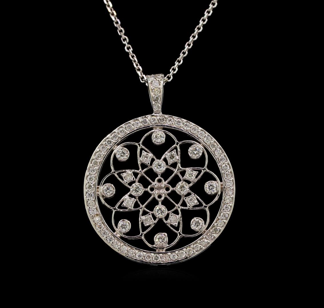 One electronically tested 14KT white gold ladies cast diamond pendant & chain 18.0" long, with a spring ring clasp with a bright polish finish. Identified with markings of "14K". Condition is new. Containing: Eighty-Eight prong set round brilliant cut diamonds, measuring 1.80 - 1.00 x 0.84mm (depth est.) approximate total weight of 88 Stones = 0.40ct. Clarity: SI-1 to I-1. Color: I - J, Cut is Good. All diamonds are graded in the mounting, unless otherwise stated. Total Weight of Diamonds 0.40ct. Total Weight of Pendant & Chain 6.00 grams. GGL Appraised at $2,115.00.