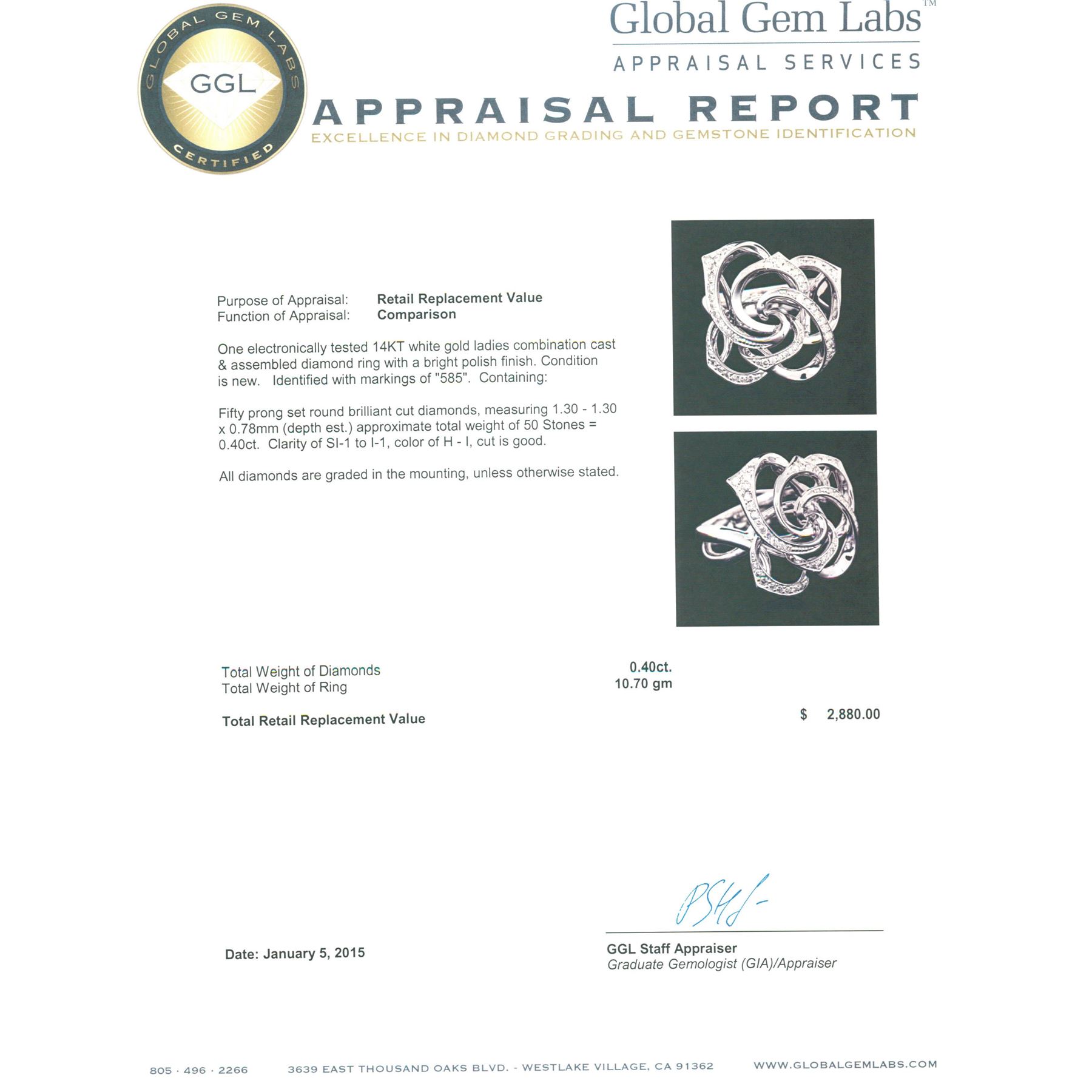 One electronically tested 14KT white gold ladies combination cast & assembled diamond ring with a bright polish finish. Identified with markings of "585". Condition is new. Containing: Fifty prong set round brilliant cut diamonds, measuring 1.30 - 1.30 x 0.78mm (depth est.) approximate total weight of 50 Stones = 0.40ct. Clarity: SI-1 to I-1. Color: H - I, Cut is Good. All diamonds are graded in the mounting, unless otherwise stated. Total Weight of Diamonds 0.40ct. Total Weight of Ring 10.70 grams. GGL Appraised at $2,880.00.