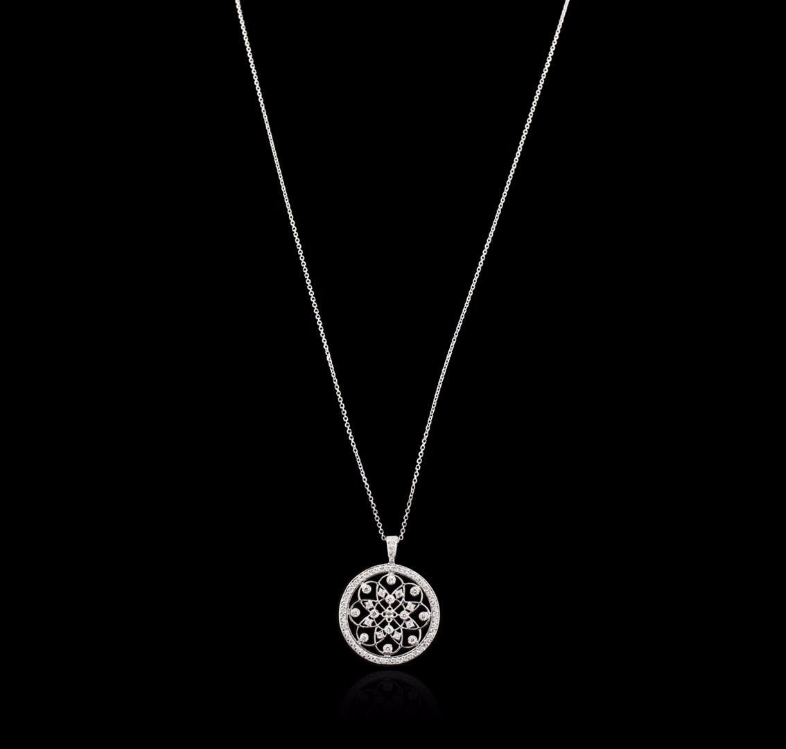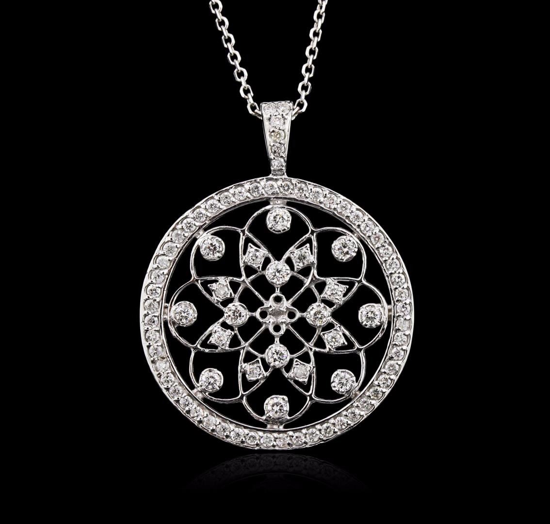 One electronically tested 14KT white gold ladies cast diamond pendant & chain 18.0" long, with a spring ring clasp with a bright polish finish. Identified with markings of "14K". Condition is new. Containing: Eighty-Eight prong set round brilliant cut diamonds, measuring 1.80 - 1.00 x 0.84mm (depth est.) approximate total weight of 88 Stones = 0.40ct. Clarity: SI-1 to I-1. Color: I - J, Cut is Good. All diamonds are graded in the mounting, unless otherwise stated. Total Weight of Diamonds 0.40ct. Total Weight of Pendant & Chain 6.00 grams. GGL Appraised at $2,115.00.