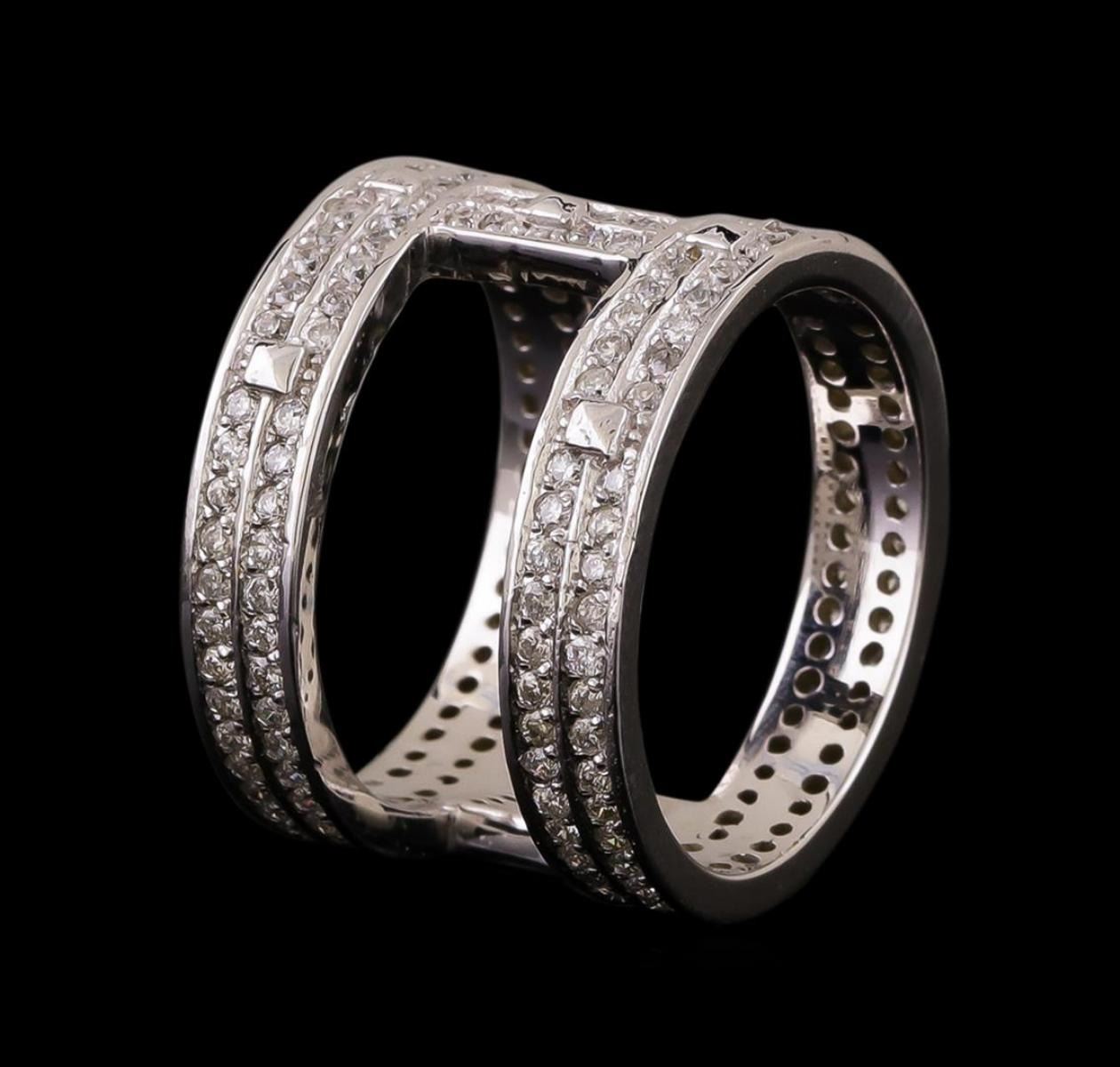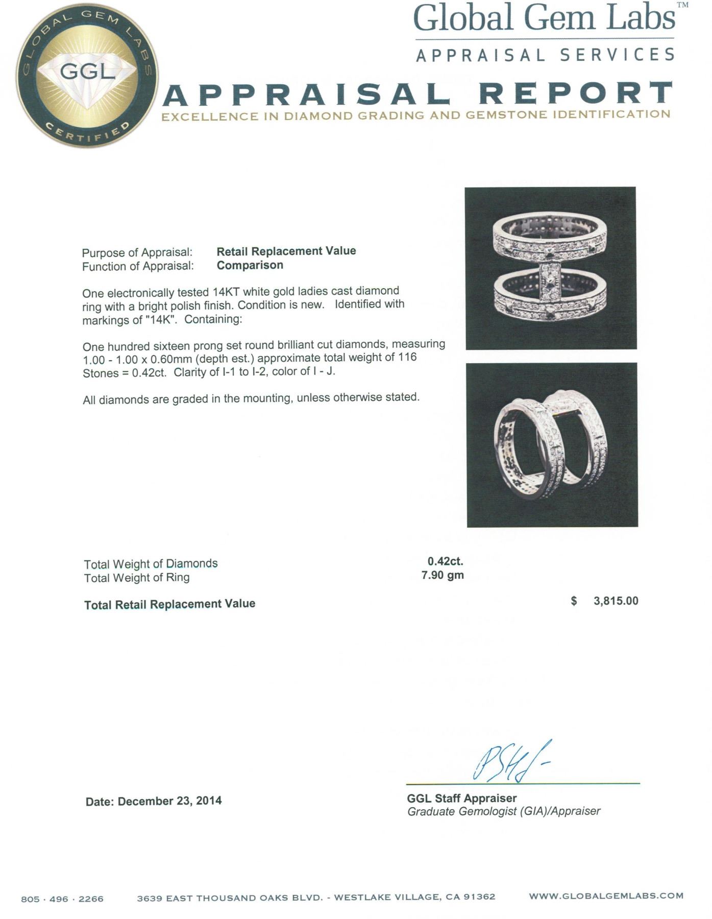 One electronically tested 14KT white gold ladies cast diamond ring with a bright polish finish. Identified with markings of "14K". Condition is new. Containing: One Hundred Sixteen prong set round brilliant cut diamonds, measuring 1.00 - 1.00 x 0.60mm (depth est.) approximate total weight of 116 Stones = 0.42ct. Clarity: I-1 to I-2. Color: I - J. All diamonds are graded in the mounting, unless otherwise stated. Total Weight of Diamonds 0.42ct. Total Weight of Ring 7.90 grams. GGL Appraised.
