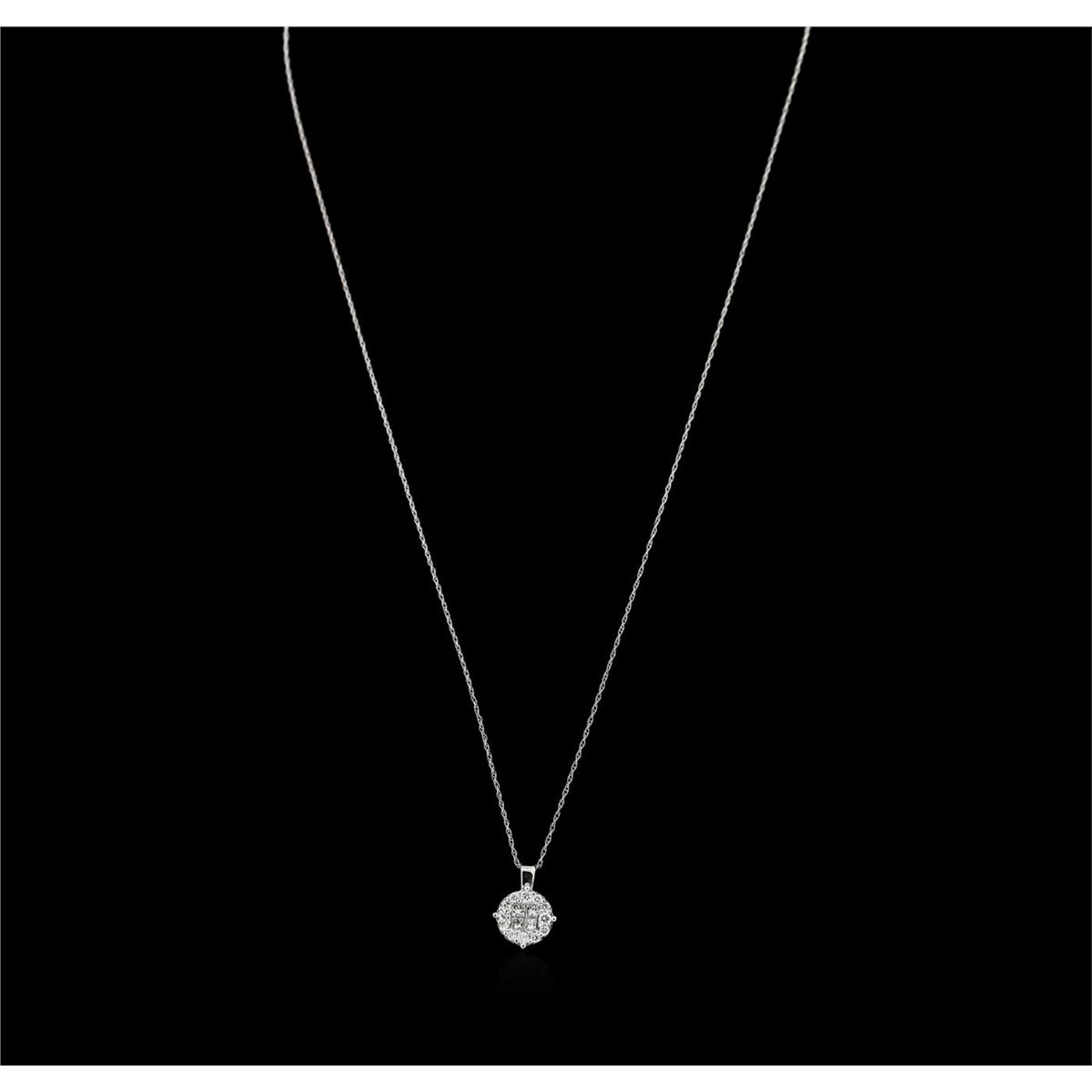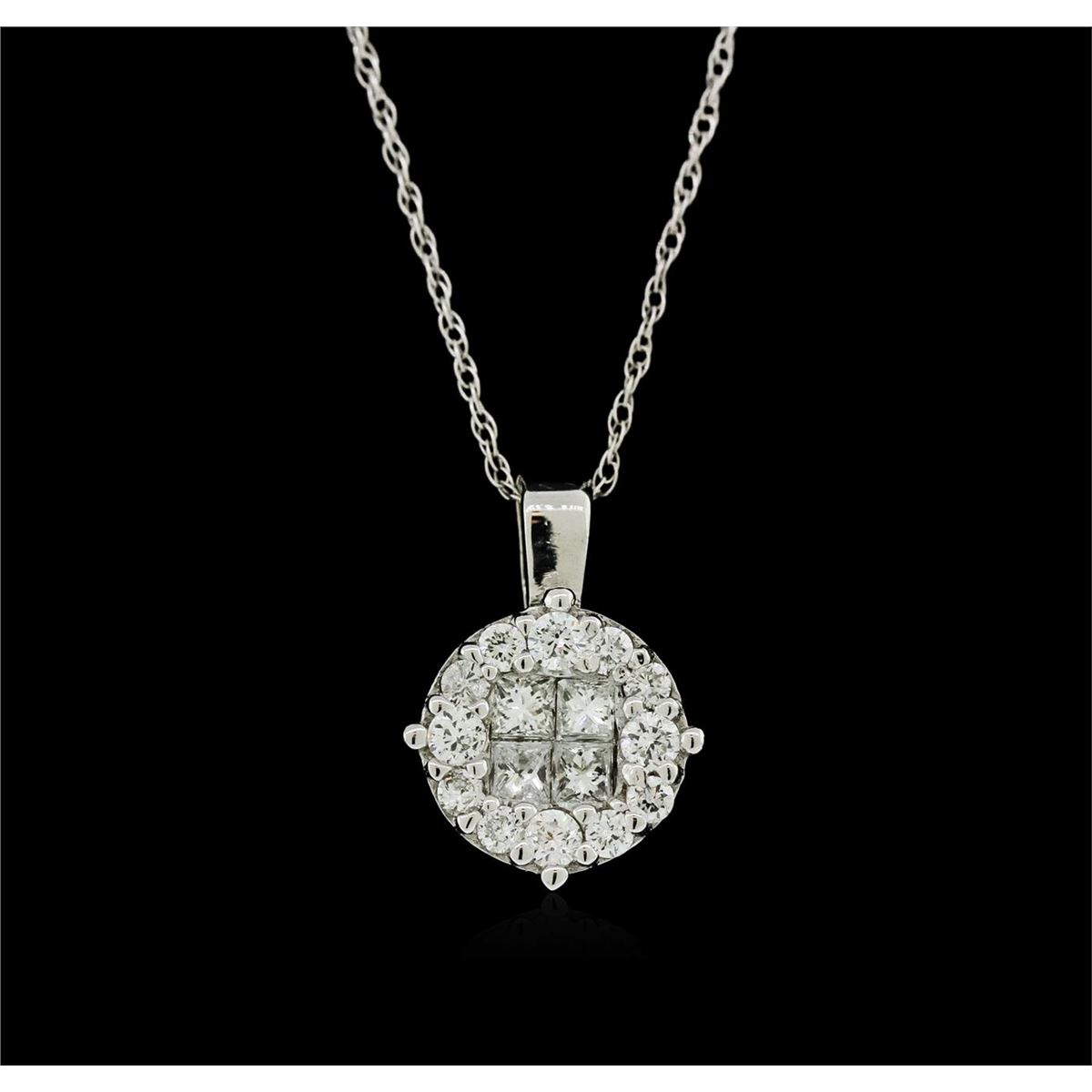 One pendant with chain featuring: 14KT white gold weighing 1.60 grams containing invisible set princess cut diamonds and pave set round diamonds for a total diamond weight of 0.42ct.