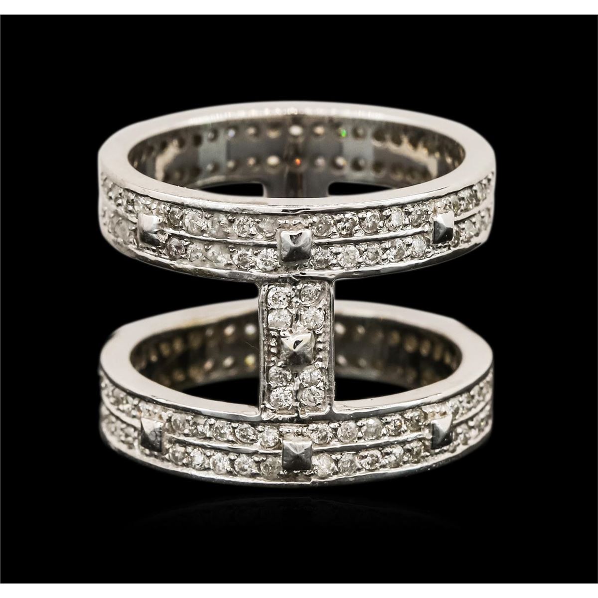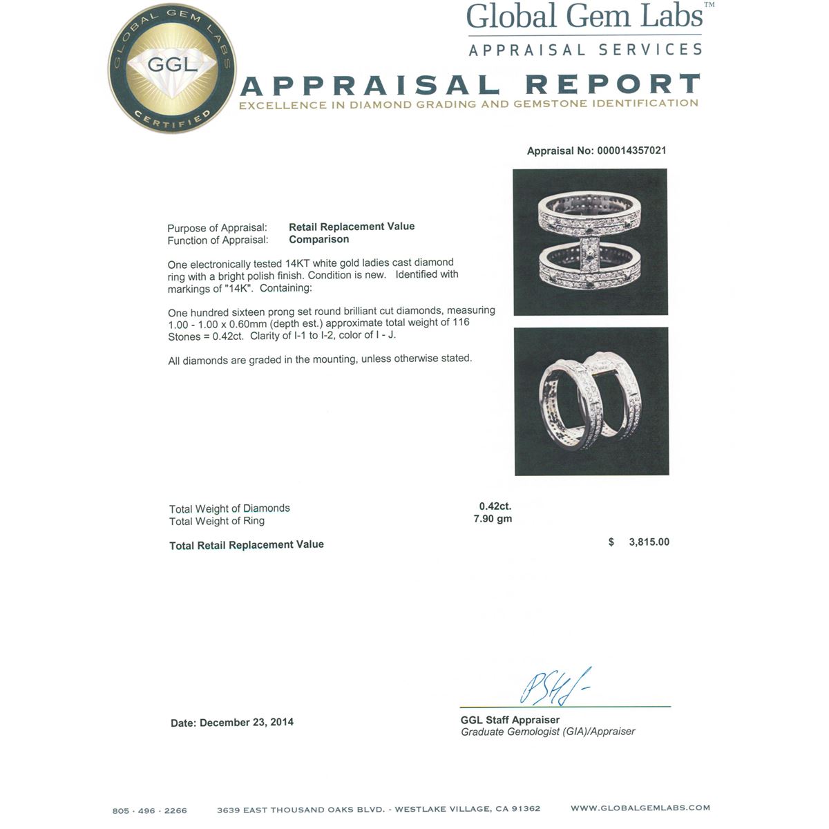 One electronically tested 14KT white gold ladies cast diamond ring with a bright polish finish. Identified with markings of "14K". Condition is new. Containing: One Hundred Sixteen prong set round brilliant cut diamonds, measuring 1.00 - 1.00 x 0.60mm (depth est.) approximate total weight of 116 Stones = 0.42ct. Clarity: I-1 to I-2. Color: I - J. All diamonds are graded in the mounting, unless otherwise stated. Total Weight of Diamonds 0.42ct. Total Weight of Ring 7.90 grams. GGL Appraised at $3,815.00.