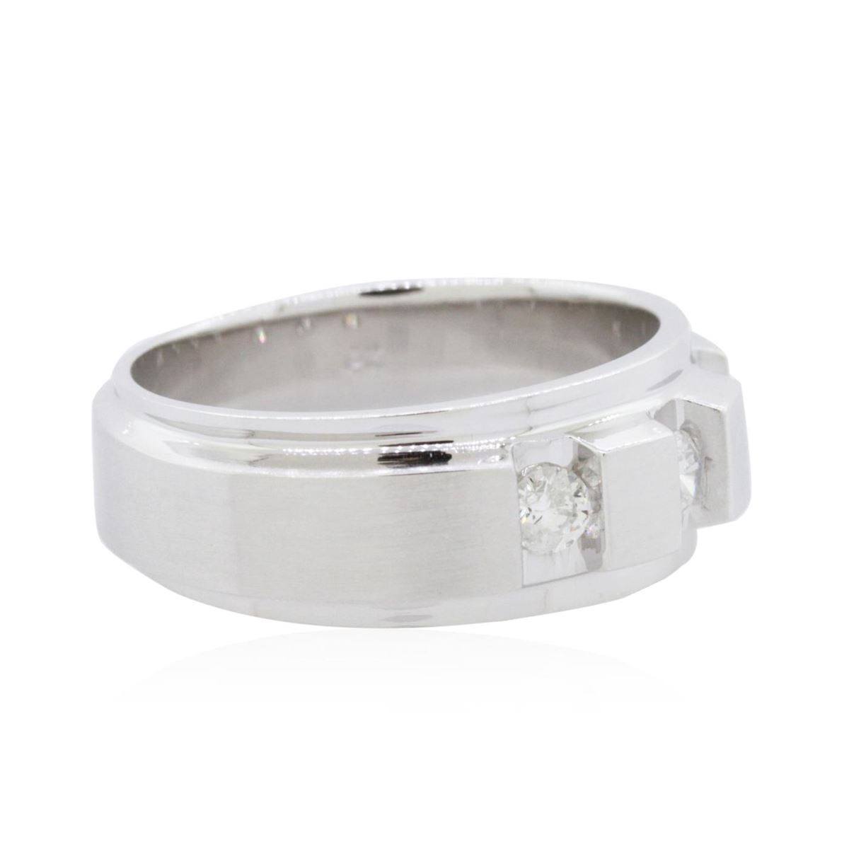 One electronically tested 14KT white gold mens combination cast & assembled diamond ring with a brushed finish. Identified with markings of "14K". Condition is new. Containing: Three prong set round brilliant cut diamonds, measuring 3.40 - 3.40 x 2.04mm (depth est.) approximate total weight of 3 Stones = 0.43ct. Clarity: SI-2 to I-2. Color: J - K, Cut is Good. All diamonds are graded in the mounting, unless otherwise stated. Total Weight of Diamonds 0.43ct. Total Weight of Ring 12.40 grams. GGL Appraised at $3,850.00.