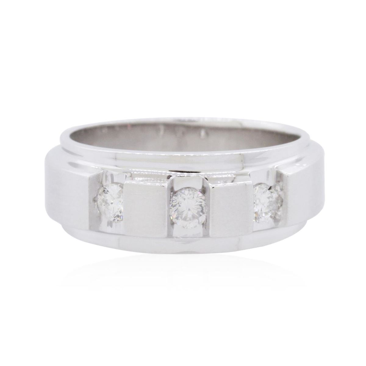 One electronically tested 14KT white gold mens combination cast & assembled diamond ring with a brushed finish. Identified with markings of "14K". Condition is new. Containing: Three prong set round brilliant cut diamonds, measuring 3.40 - 3.40 x 2.04mm (depth est.) approximate total weight of 3 Stones = 0.43ct. Clarity: SI-2 to I-2. Color: J - K, Cut is Good. All diamonds are graded in the mounting, unless otherwise stated. Total Weight of Diamonds 0.43ct. Total Weight of Ring 12.40 grams. GGL Appraised at $3,850.00.
