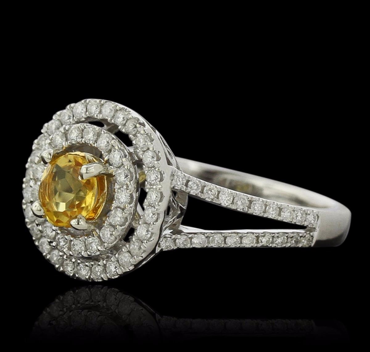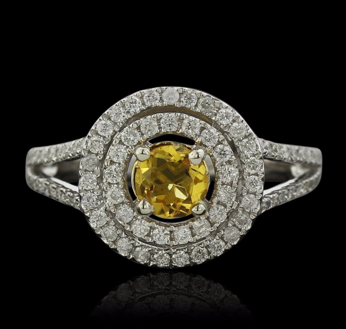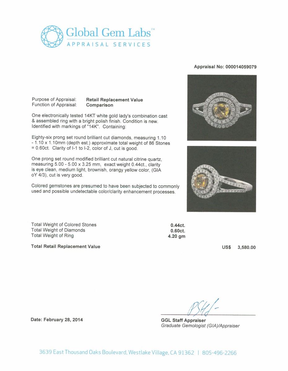 One electronically tested 14KT white gold Ladies combination cast & assembled ring with a bright polish finish. Condition is new. Identified with markings of "14K". Containing: Eighty-Six prong set round brilliant cut diamonds, measuring 1.10 - 1.10 x 1.10mm (depth est.) approximate. Total Weight of 86 Stones = 0.60ct. Clarity: I-1 to I-2. Color: J, Cut is Good. One prong set round modified brilliant cut natural citrine quartz, measuring 5.00 - 5.00 x 3.25 mm, exact weight 0.44ct., clarity is eye clean, medium light, brownish, orangy yellow color, (GIA oY 4/3), cut is very good. Colored gemstones are presumed to have been subjected to commonly used and possible undetectable color/clarity enhancement processes. Total Weight of Colored Stones 0.44ct. Total Weight of Diamonds 0.60ct. Total Weight of Ring 4.20 grams. GGL Appraised at $3,580.00.