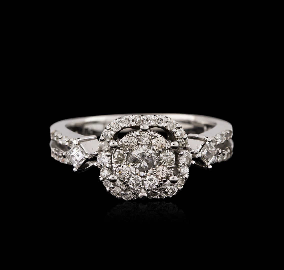 One electronically tested 14KT white gold ladies cast diamond engagement ring with a bright polish finish. Identified with markings of "14K". Condition is new. Containing: One prong set round brilliant cut diamond, measuring 3.50 - 3.50 x 2.10mm (depth est.) approximate weight of 0.16ct. Clarity: I-2. Color: J, Cut is Good. Thirty-Six prong set round brilliant cut diamonds, measuring 1.80 - 1.00 x 0.84mm (depth est.) approximate total weight of 36 Stones = 0.20ct. Clarity: I-1 to I-2. Color: I - J. Two prong set square cut diamonds, measuring 2.00 x 2.00 x 1.24mm (depth est.) approximate total weight of 2 Stones = 0.08ct. Clarity: SI-1. Color: I - J, Cut is Good. All diamonds are graded in the mounting, unless otherwise stated. Total Weight of Diamonds 0.44ct. Total Weight of Engagement Ring 4.10 grams. GGL Appraised at $2,575.00.
