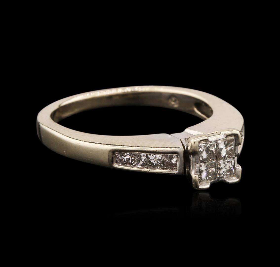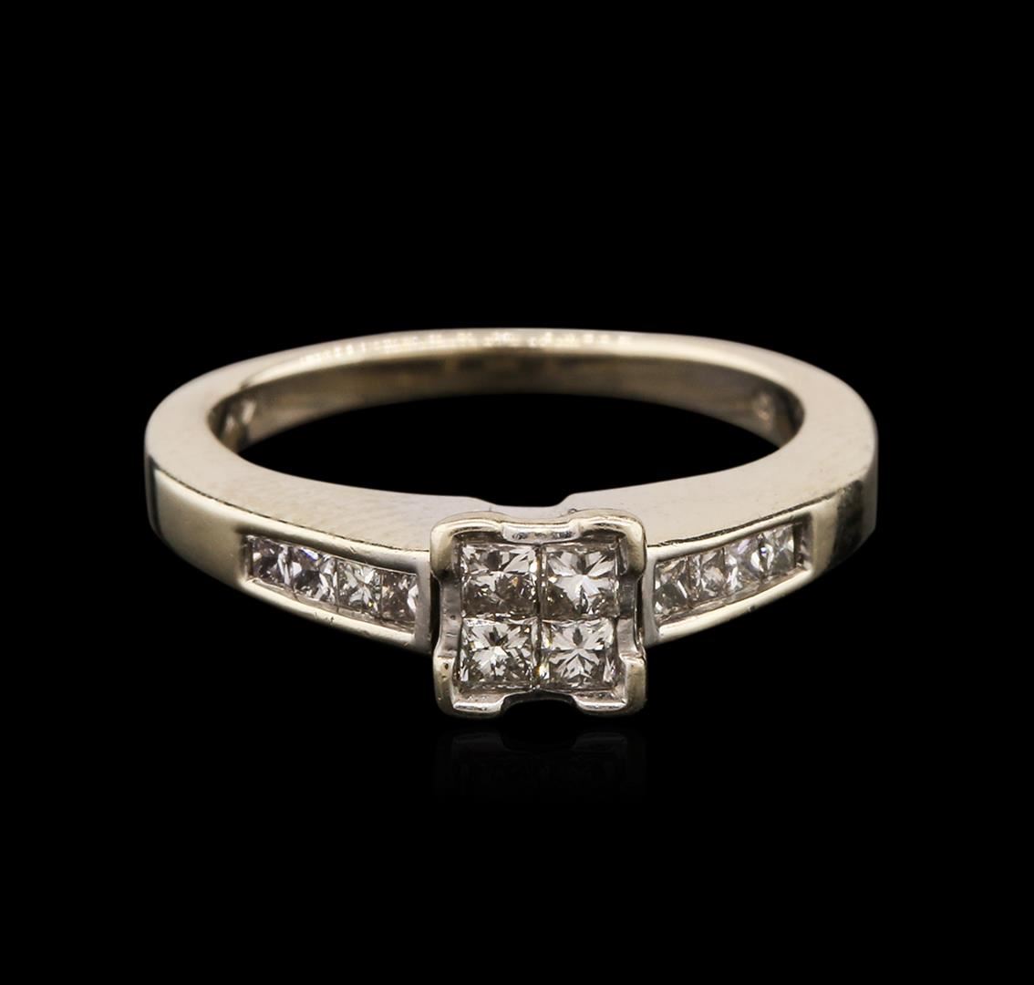 One electronically tested 14KT white gold ladies cast diamond unity ring with a bright polish finish. The ring features an invisible set diamond cluster supported by diamond set shoulders, completed by a one and one-half millimeter wide band. Identified with markings of "14K". Condition is good. Containing: Four invisible set princess cut diamonds, measuring 2.10 x 2.00 x 1.50mm (depth est.) approximate total weight of 4 Stones = 0.25ct. Graded in the setting. Clarity: SI-2 to I-1. Color: I - J Eight channel set princess cut diamonds, measuring 1.70 x 1.50 x 1.13mm (depth est.) approximate total weight of 8 Stones = 0.20ct. Graded in the setting. Clarity: SI-2 to I-1. Color: I - K. Total Weight of Diamonds 0.45ct. Total Weight of Ring 3.80 grams. AIG Appraised at $1,454.42.