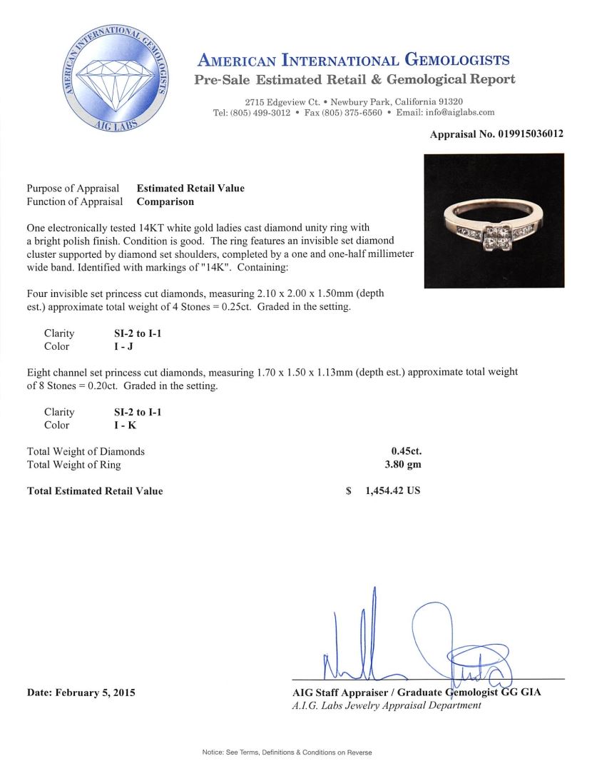 One electronically tested 14KT white gold ladies cast diamond unity ring with a bright polish finish. The ring features an invisible set diamond cluster supported by diamond set shoulders, completed by a one and one-half millimeter wide band. Identified with markings of "14K". Condition is good. Containing: Four invisible set princess cut diamonds, measuring 2.10 x 2.00 x 1.50mm (depth est.) approximate total weight of 4 Stones = 0.25ct. Graded in the setting. Clarity: SI-2 to I-1. Color: I - J Eight channel set princess cut diamonds, measuring 1.70 x 1.50 x 1.13mm (depth est.) approximate total weight of 8 Stones = 0.20ct. Graded in the setting. Clarity: SI-2 to I-1. Color: I - K. Total Weight of Diamonds 0.45ct. Total Weight of Ring 3.80 grams. AIG Appraised at $1,454.42.