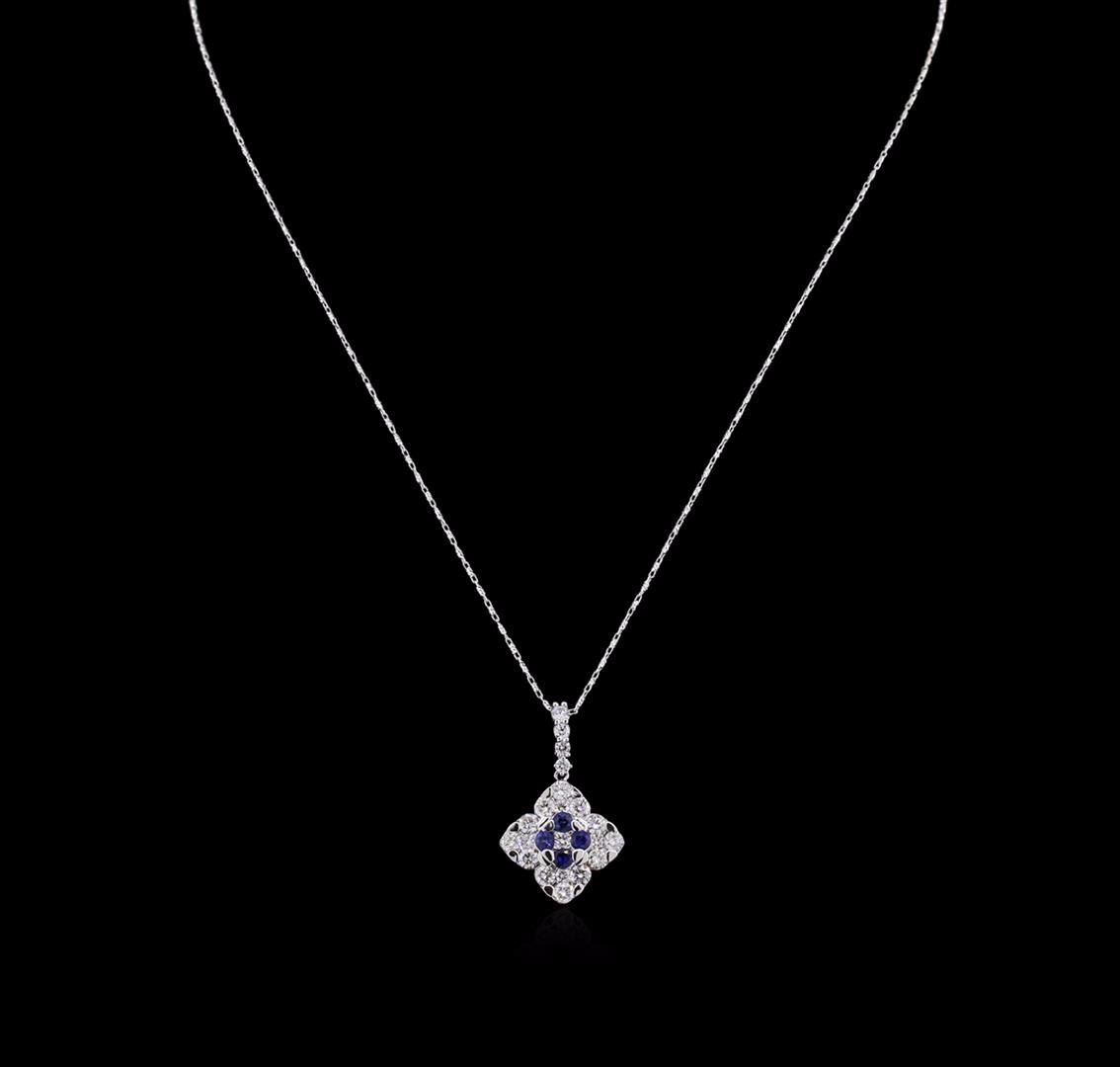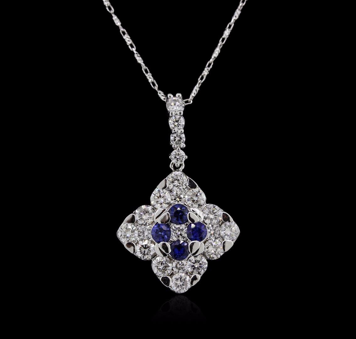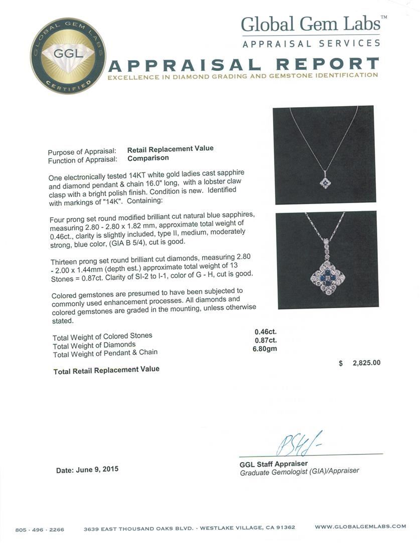 One electronically tested 14KT white gold ladies cast sapphire and diamond pendant & chain 16.0" long, with a lobster claw clasp with a bright polish finish. Identified with markings of "14K". Condition is new. Containing: Four prong set round modified brilliant cut natural blue sapphires, measuring 2.80 - 2.80 x 1.82 mm, approximate total weight of 0.46ct., clarity is slightly included, type II, medium, moderately strong, blue color, (GIA B 5/4), cut is good. Thirteen prong set round brilliant cut diamonds, measuring 2.80 - 2.00 x 1.44mm (depth est.) approximate total weight of 13 Stones = 0.87ct. Clarity: SI-2 to I-1. Color: G - H, Cut is Good. Colored gemstones are presumed to have been subjected to commonly used enhancement processes. All diamonds and colored gemstones are graded in the mounting, unless otherwise stated. Total Weight of Colored Stones 0.46ct. Total Weight of Diamonds 0.87ct. Total Weight of Pendant & Chain 6.80 grams. GGL Appraised at $2,825.00.