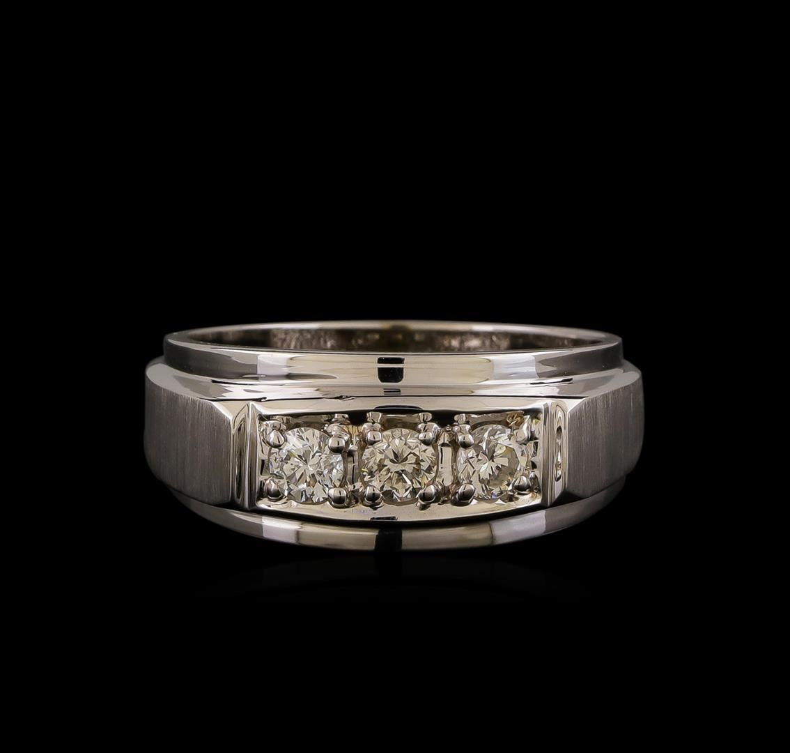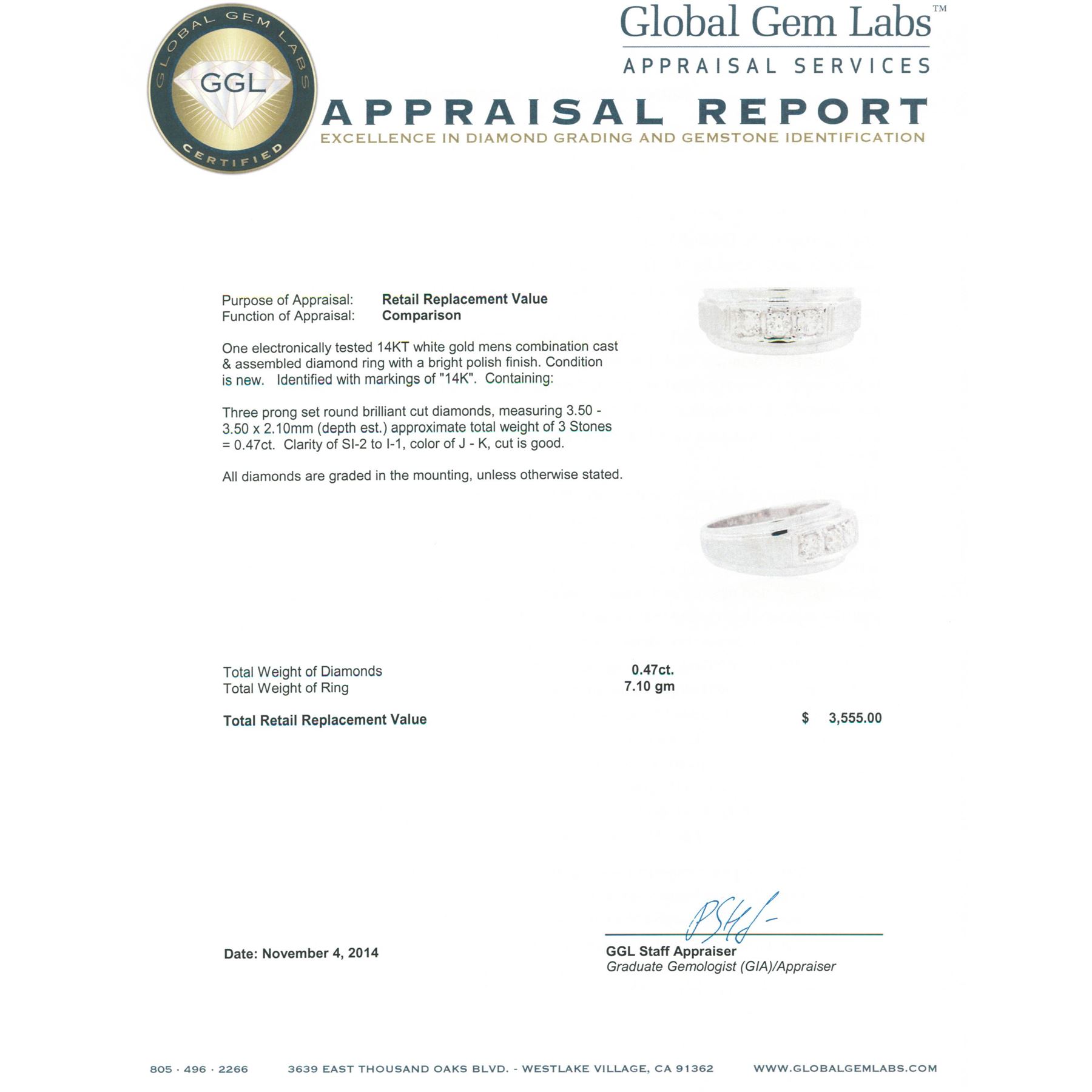 One electronically tested 14KT white gold mens combination cast & assembled diamond ring with a bright polish finish. Identified with markings of "14K". Condition is new. Containing: Three prong set round brilliant cut diamonds, measuring 3.50 - 3.50 x 2.10mm (depth est.) approximate total weight of 3 Stones = 0.47ct. Clarity: SI-2 to I-1. Color: J - K, Cut is Good. All diamonds are graded in the mounting, unless otherwise stated. Total Weight of Diamonds 0.47ct. Total Weight of Ring 7.10 grams. GGL Appraised at $3,555.00.
