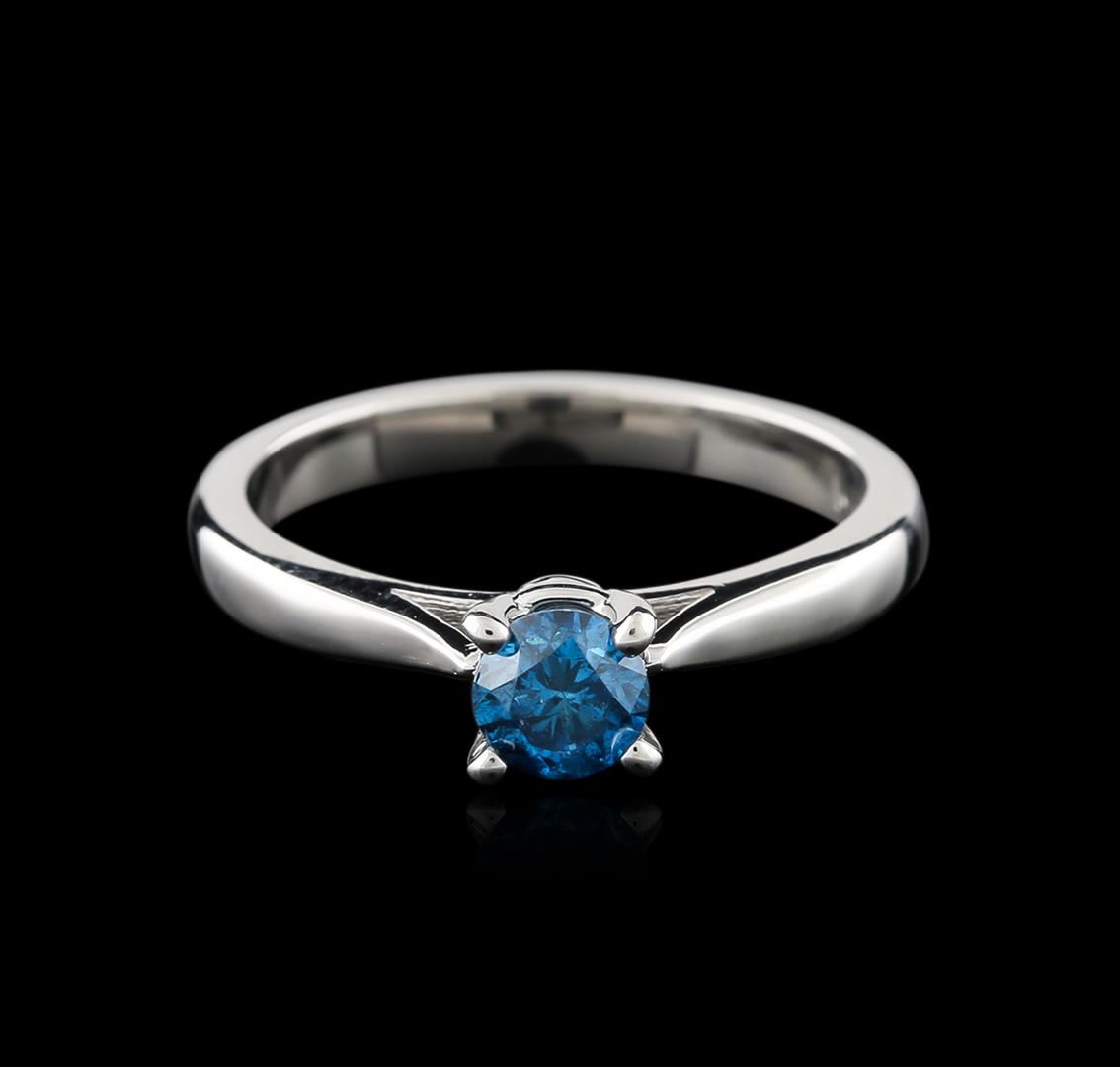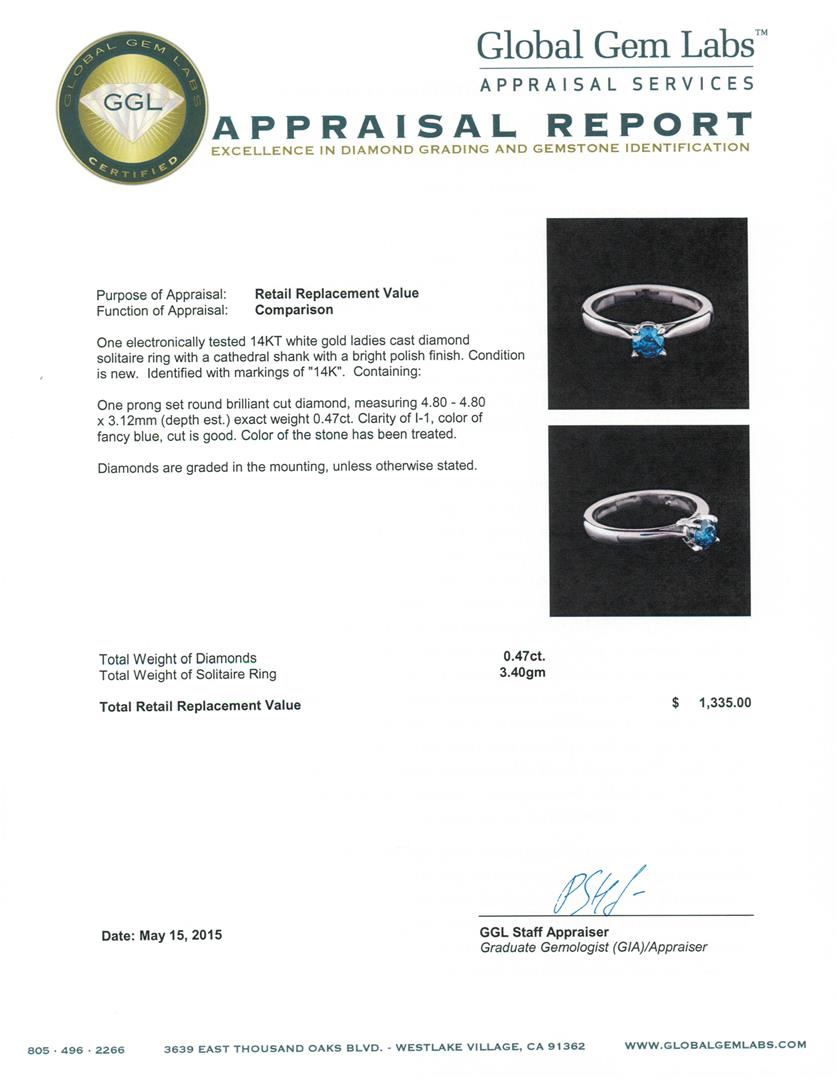 One electronically tested 14KT white gold ladies cast diamond solitaire ring with a cathedral shank with a bright polish finish. Identified with markings of "14K". Condition is new. Containing: One prong set round brilliant cut diamond, measuring 4.80 - 4.80 x 3.12mm (depth est.) exact weight 0.47ct. Clarity: I-1, Cut is Good. Color of the stone has been treated. Diamonds are graded in the mounting, unless otherwise stated. Total Weight of Diamonds 0.47ct. Total Weight of Solitaire Ring 3.40 grams. GGL Appraised at $1,335.00.