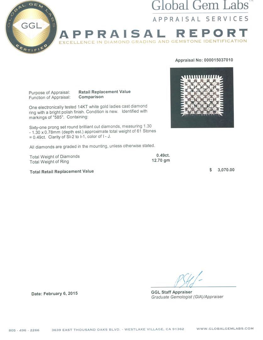 One electronically tested 14KT white gold ladies cast diamond ring with a bright polish finish. Identified with markings of "585". Condition is new. Containing: Sixty-One prong set round brilliant cut diamonds, measuring 1.30 - 1.30 x 0.78mm (depth est.) approximate total weight of 61 Stones = 0.49ct. Clarity: SI-2 to I-1. Color: I - J. All diamonds are graded in the mounting, unless otherwise stated. Total Weight of Diamonds 0.49ct. Total Weight of Ring 12.70 grams. GGL Appraised at $3,070.00.