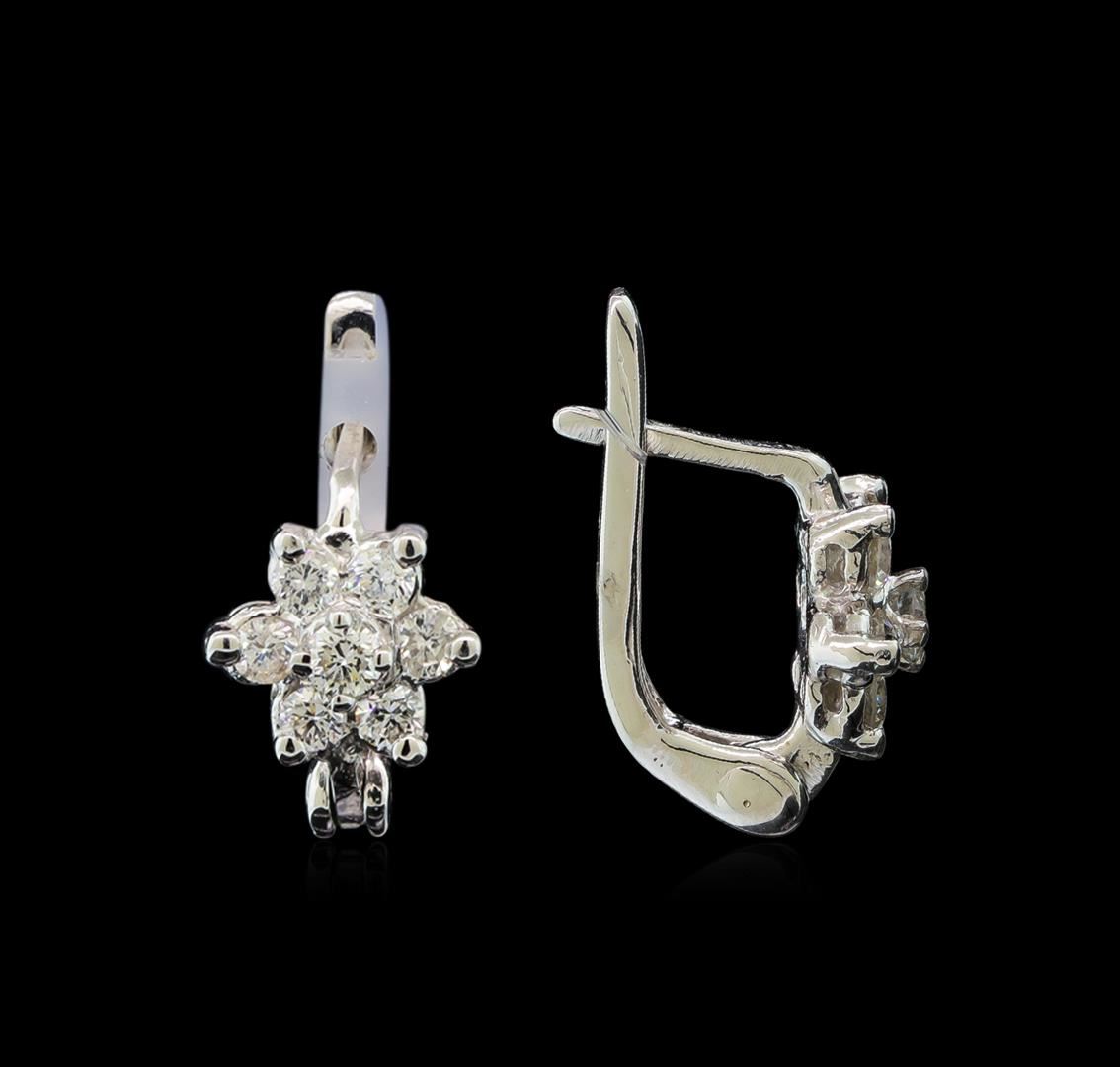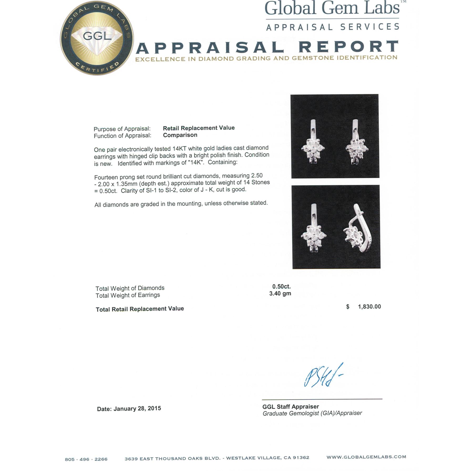 One pair electronically tested 14KT white gold ladies cast diamond earrings with hinged clip backs with a bright polish finish. Identified with markings of "14K". Condition is new. Containing: Fourteen prong set round brilliant cut diamonds, measuring 2.50 - 2.00 x 1.35mm (depth est.) approximate total weight of 14 Stones = 0.50ct. Clarity: SI-1 to SI-2. Color: J - K, Cut is Good. All diamonds are graded in the mounting, unless otherwise stated. Total Weight of Diamonds 0.50ct. Total Weight of Earrings 3.40 grams. GGL Appraised at $1,830.00.