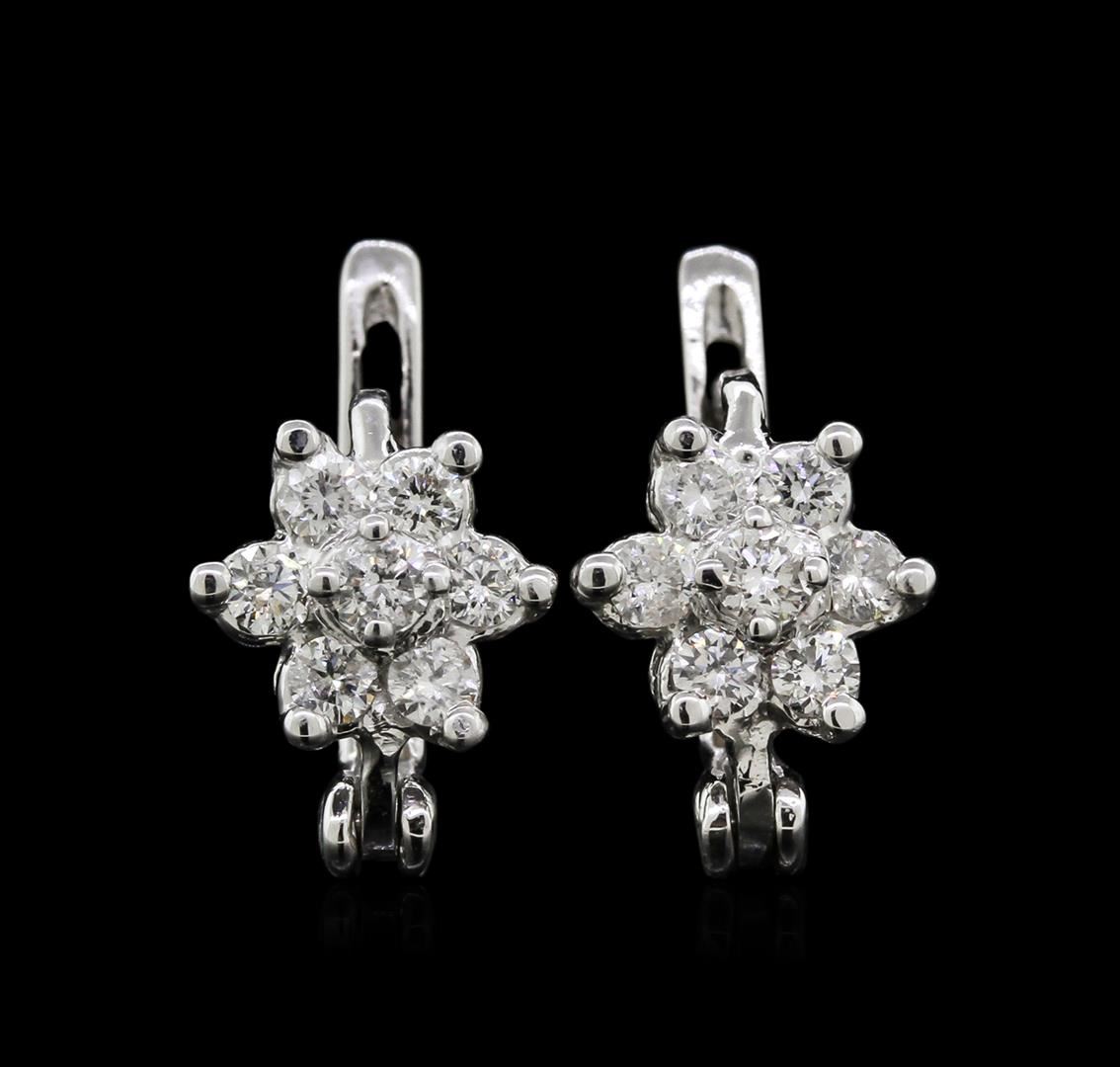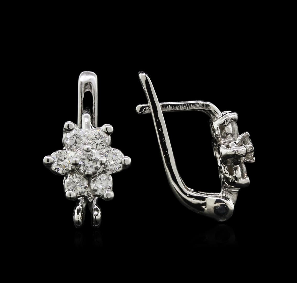 One pair electronically tested 14KT white gold ladies cast diamond earrings with hinged clip backs with a bright polish finish. Identified with markings of "14K". Condition is new. Containing: Fourteen prong set round brilliant cut diamonds, measuring 2.50 - 2.00 x 1.35mm (depth est.) approximate total weight of 14 Stones = 0.50ct. Clarity: SI-1 to SI-2. Color: J - K, Cut is Good. All diamonds are graded in the mounting, unless otherwise stated. Total Weight of Diamonds 0.50ct. Total Weight of Earrings 3.40 grams. GGL Appraised at $1,830.00.