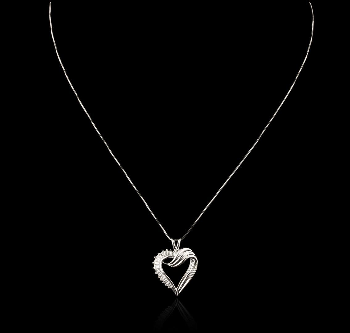 One heart pendant with chain featuring: 14KT white gold weighing 4.45 grams containing prong set baguette cut diamonds with a total weight of 0.50ct.