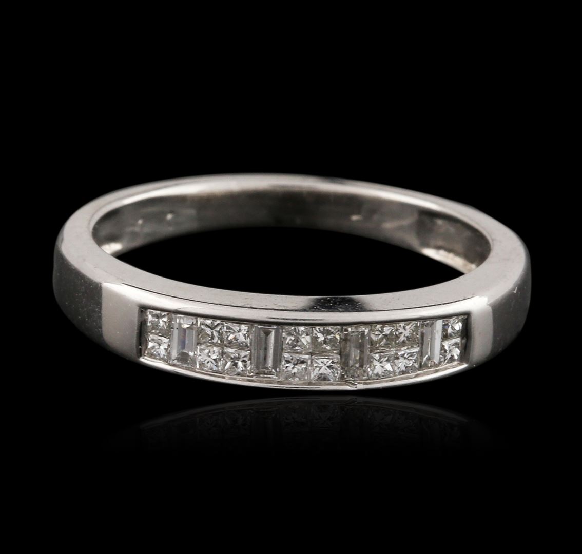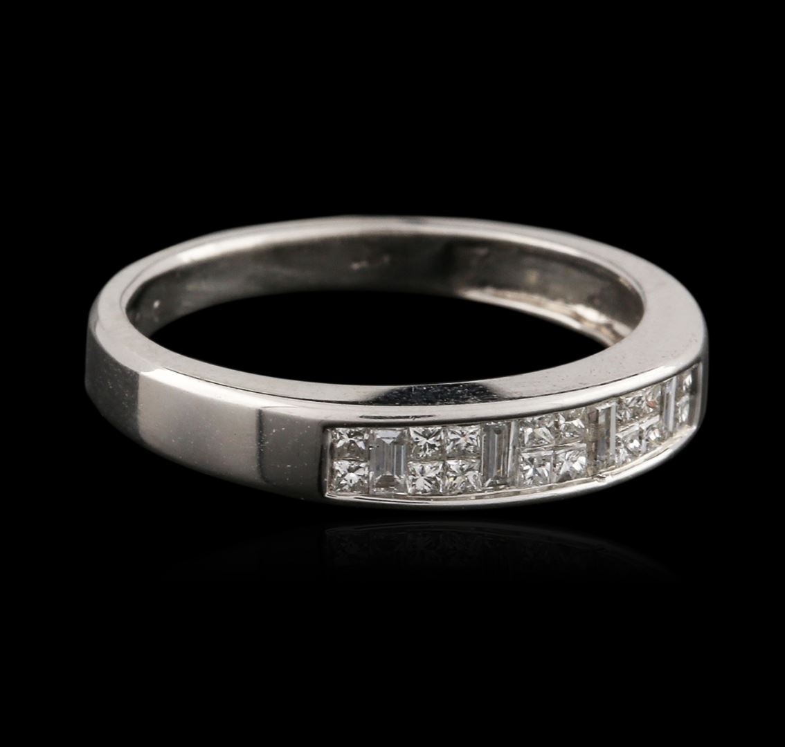 One ring featuring: 14KT white gold weighing 2.50 grams containing invisible set princess cut diamonds and channel set baguette cut diamonds with a total weight of 0.50ct.