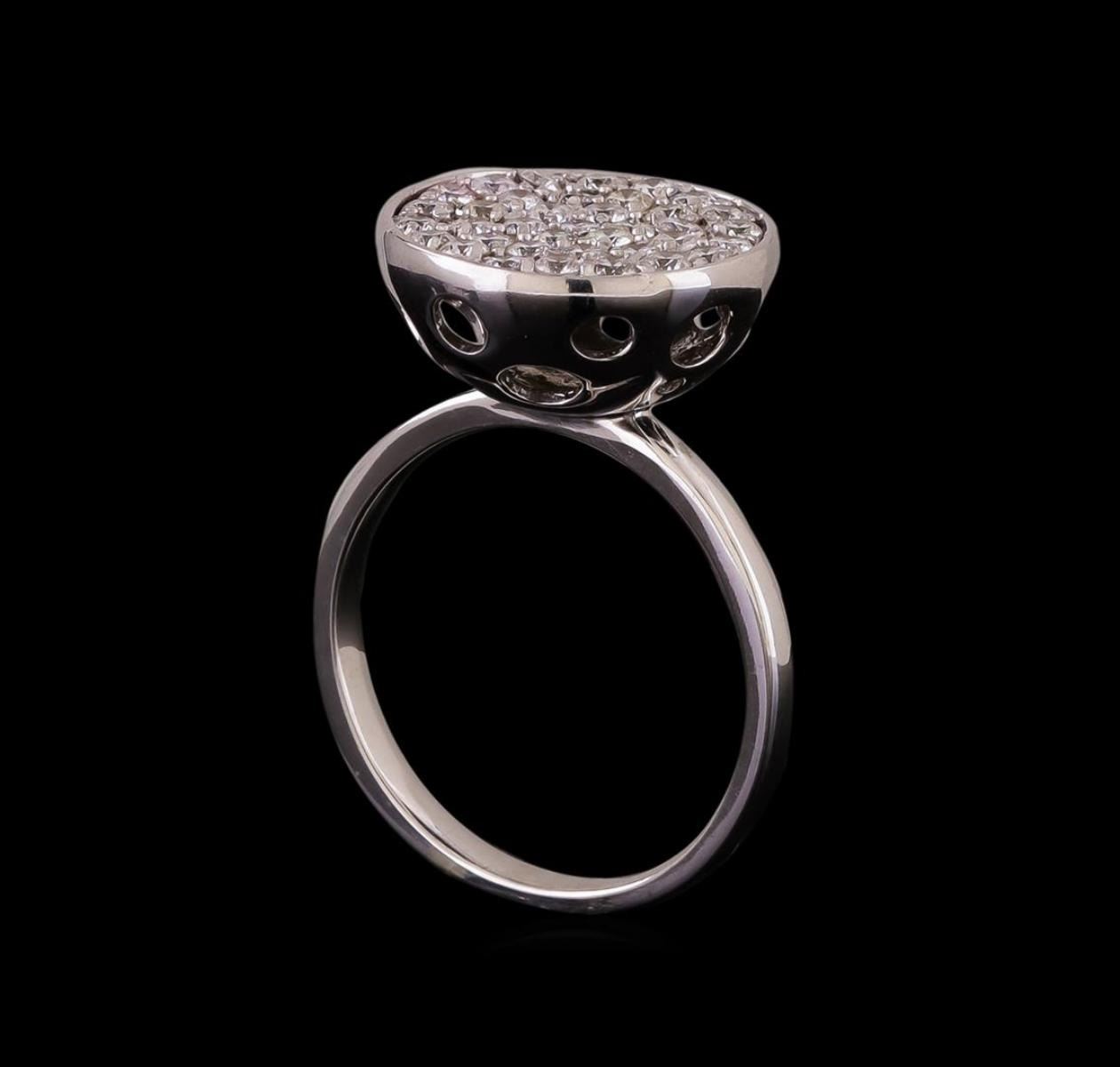 One electronically tested 14KT white gold ladies cast diamond ring with a bright polish finish. Identified with markings of "585". Condition is new. Containing: Thirty-Four prong set round brilliant cut diamonds, measuring 1.60 - 1.60 x 0.96mm (depth est.) approximate total weight of 34 Stones = 0.51ct. Clarity: SI-1 to SI-2. Color: I - J, Cut is Good. All diamonds are graded in the mounting, unless otherwise stated. Total Weight of Diamonds 0.51ct. Total Weight of Ring 5.30 grams. GGL Appraised.