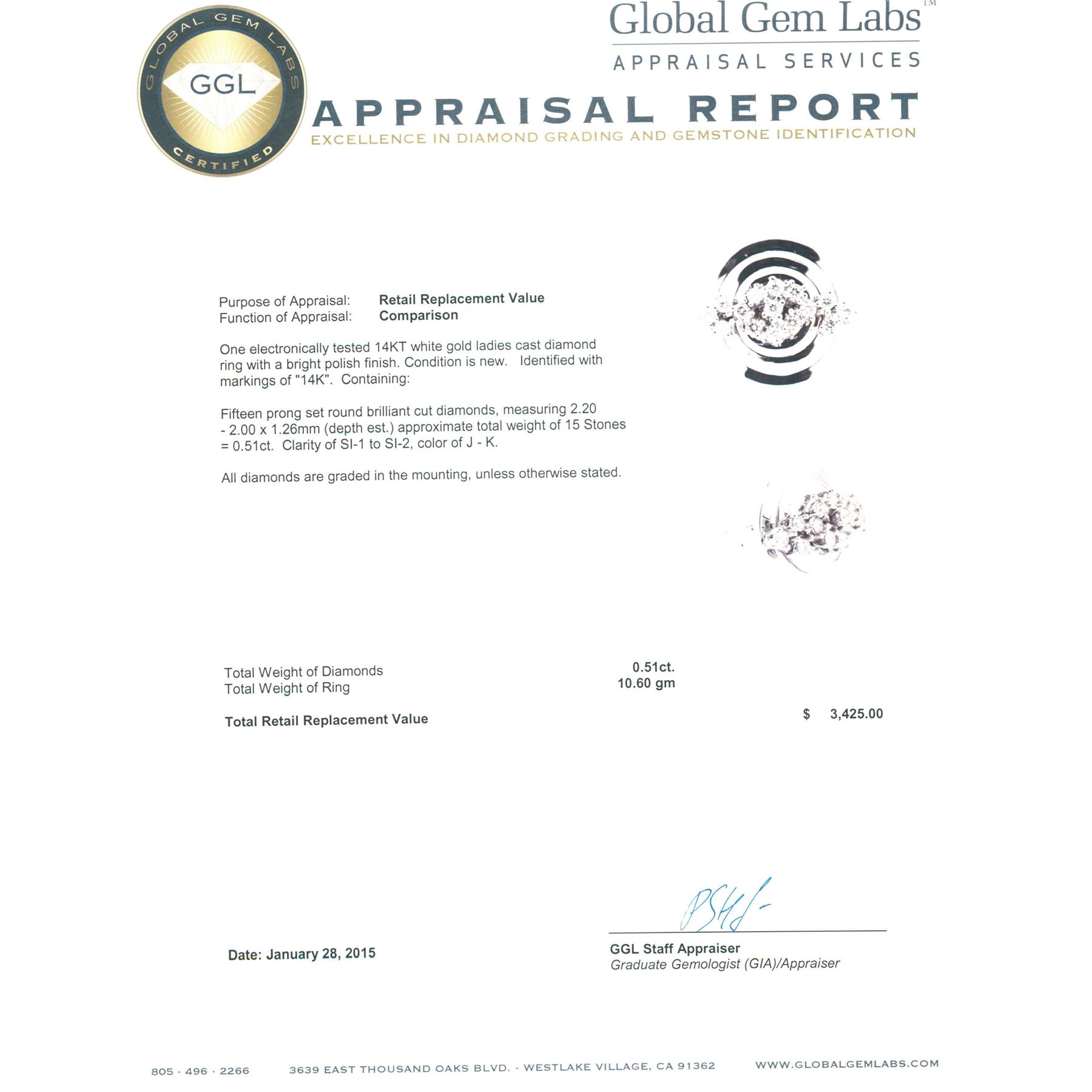 One electronically tested 14KT white gold ladies cast diamond ring with a bright polish finish. Identified with markings of "14K". Condition is new. Containing: Fifteen prong set round brilliant cut diamonds, measuring 2.20 - 2.00 x 1.26mm (depth est.) approximate total weight of 15 Stones = 0.51ct. Clarity: SI-1 to SI-2. Color: J - K. All diamonds are graded in the mounting, unless otherwise stated. Total Weight of Diamonds 0.51ct. Total Weight of Ring 10.60 grams. GGL Appraised.