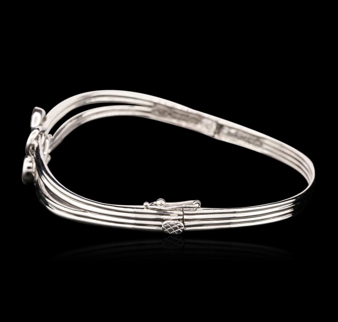 One electronically tested 14KT white gold ladies cast & assembled diamond bangle bracelet with a bright polish finish. Seven inch wearable length bangle bracelet features two round brilliant diamond set within infinity knots supported by hinged shoulders, completed by a concealed clasp with safety. Identified with markings of "14K". Condition is good. Containing: Two half bezel set round brilliant cut diamonds, measuring 4.10 - 4.00 x 2.43mm (depth est.) approximate total weight of 2 Stones = 0.52ct. Graded in the setting. Clarity: I-1. Color: K - L. Total Weight of Diamonds 0.52ct. Total Weight of Bangle Bracelet 13.73 grams. AIG Appraised at $3,625.00.