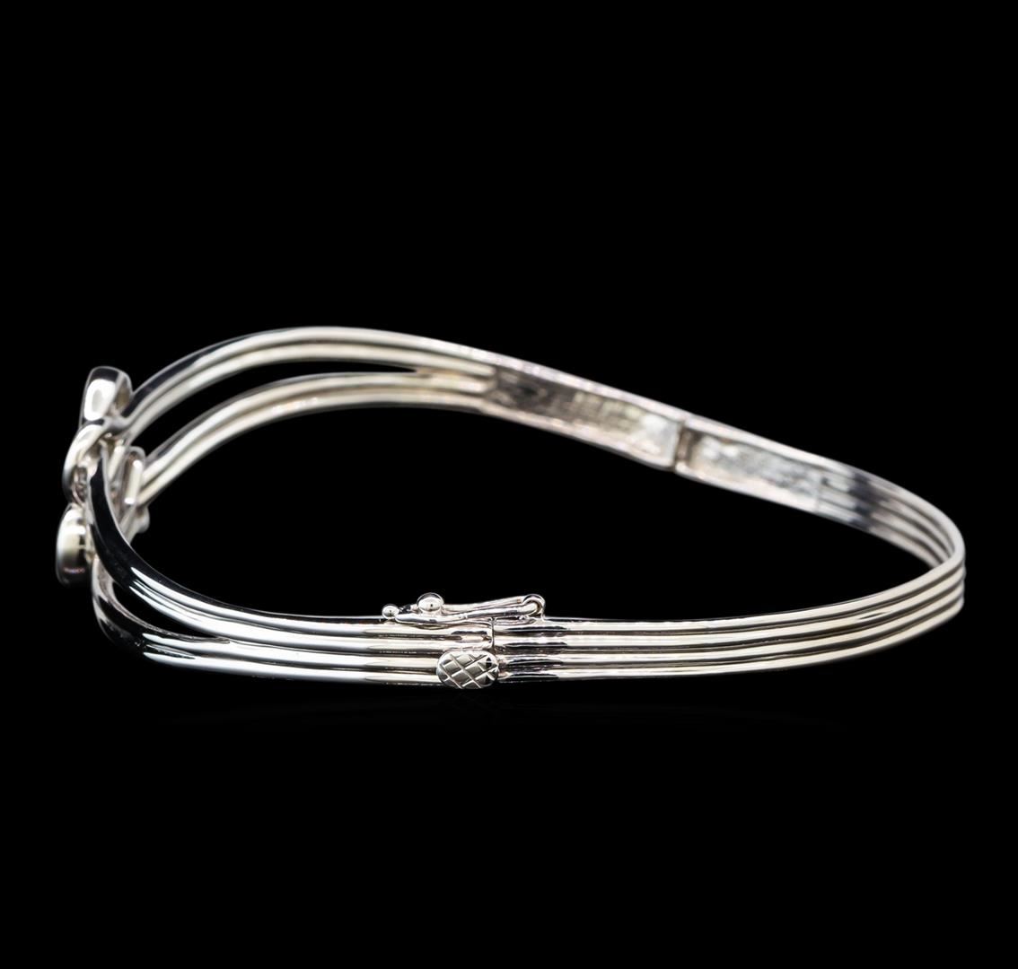 One electronically tested 14KT white gold ladies cast & assembled diamond bangle bracelet with a bright polish finish. Seven inch wearable length bangle bracelet features two round brilliant diamond set within infinity knots supported by hinged shoulders, completed by a concealed clasp with safety. Identified with markings of "14K". Condition is good. Containing: Two half bezel set round brilliant cut diamonds, measuring 4.10 - 4.00 x 2.43mm (depth est.) approximate total weight of 2 Stones = 0.52ct. Graded in the setting. Clarity: I-1. Color: K - L. Total Weight of Diamonds 0.52ct. Total Weight of Bangle Bracelet 13.73 grams. AIG Appraised at $3,625.00.