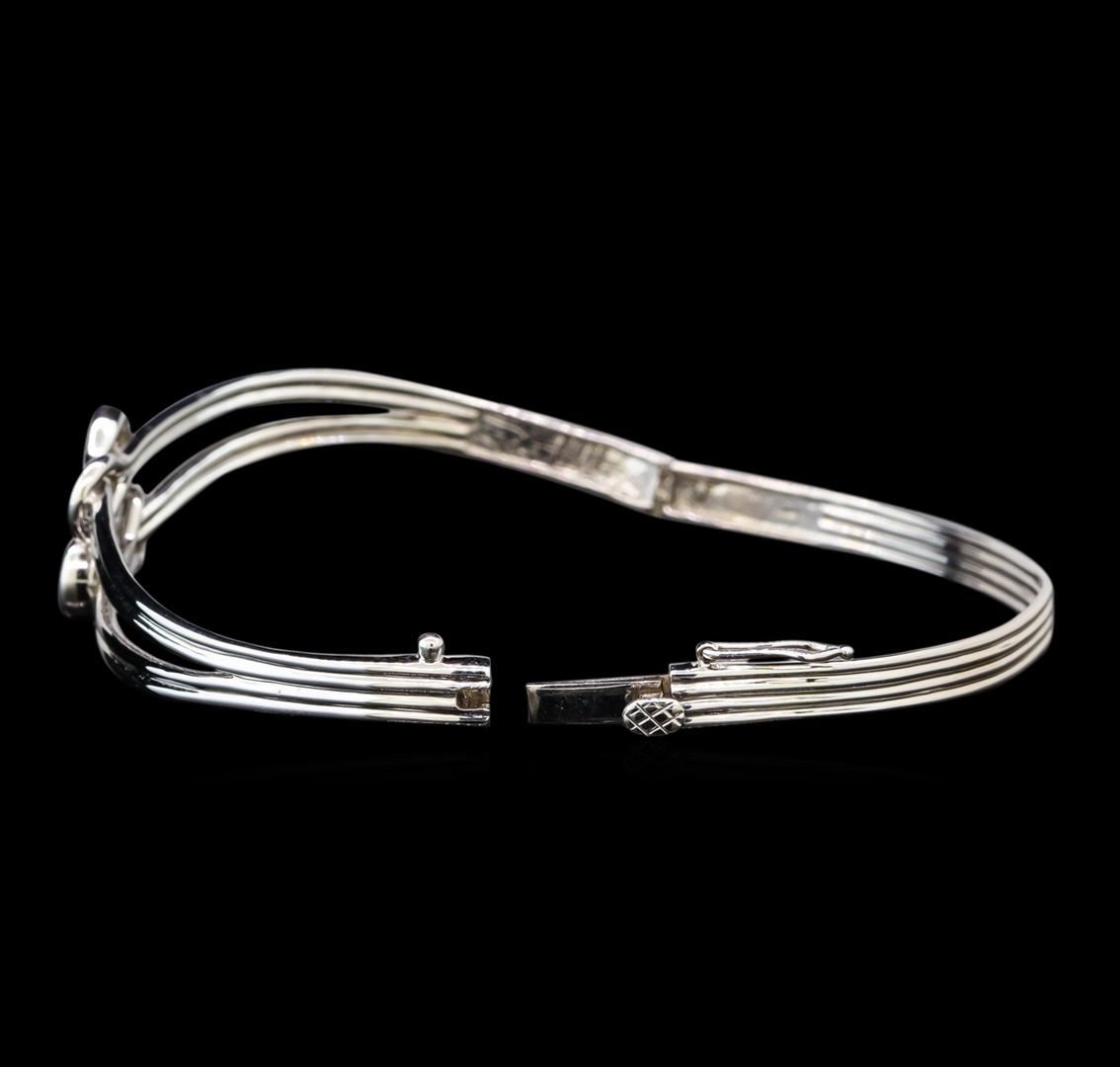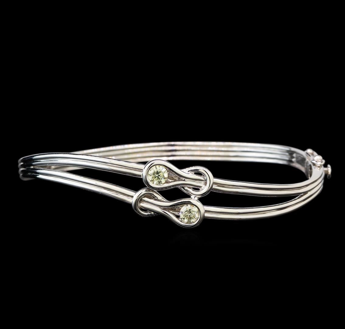One electronically tested 14KT white gold ladies cast & assembled diamond bangle bracelet with a bright polish finish. Seven inch wearable length bangle bracelet features two round brilliant diamond set within infinity knots supported by hinged shoulders, completed by a concealed clasp with safety. Identified with markings of "14K". Condition is good. Containing: Two half bezel set round brilliant cut diamonds, measuring 4.10 - 4.00 x 2.43mm (depth est.) approximate total weight of 2 Stones = 0.52ct. Graded in the setting. Clarity: I-1. Color: K - L. Total Weight of Diamonds 0.52ct. Total Weight of Bangle Bracelet 13.73 grams. AIG Appraised at $3,625.00.
