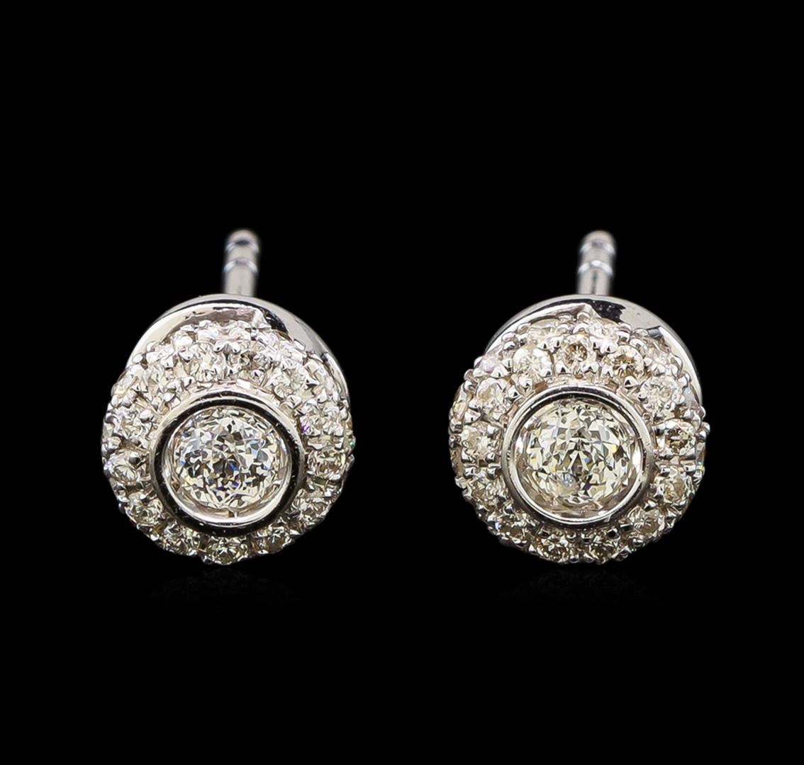 One pair electronically tested 14KT white gold cast diamond earrings with standard backs. Bright polish finish. Identified with markings of "585". Condition is new, good workmanship. Containing: Two bezel set round brilliant cut diamonds, measuring 3.20 - 3.10 x 1.89mm (depth est.) approximate total weight of 2 Stones = 0.22ct. Graded in the setting. Clarity: SI-2 to I-1. Color: H - I Fifty-Four prong set round brilliant cut diamonds, measuring 1.20 - 1.10 x 0.69mm (depth est.) approximate total weight of 54 Stones = 0.30ct. Graded in the setting. Clarity: SI-1 to I-1. Color: G - I. Total Weight of Diamonds 0.52ct. Total Weight of Earrings 1.58 grams. AIG Appraised at $1,980.00.