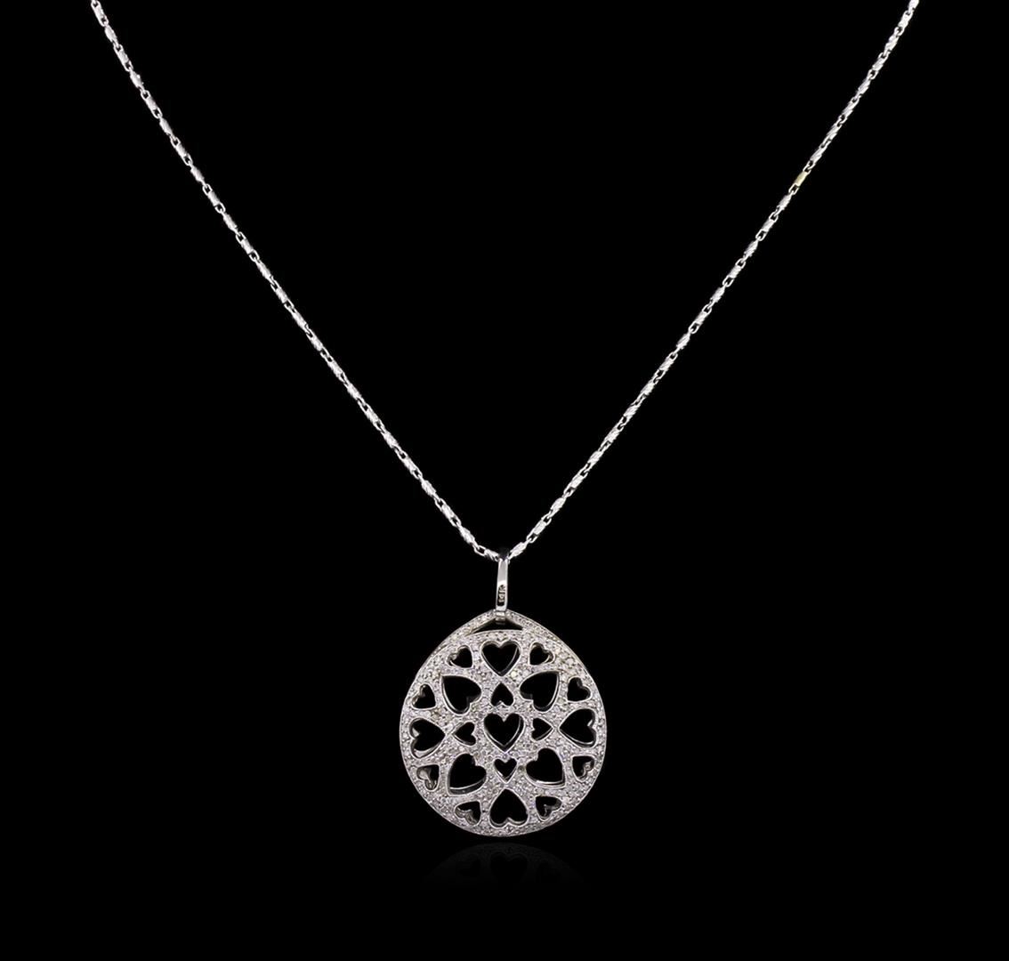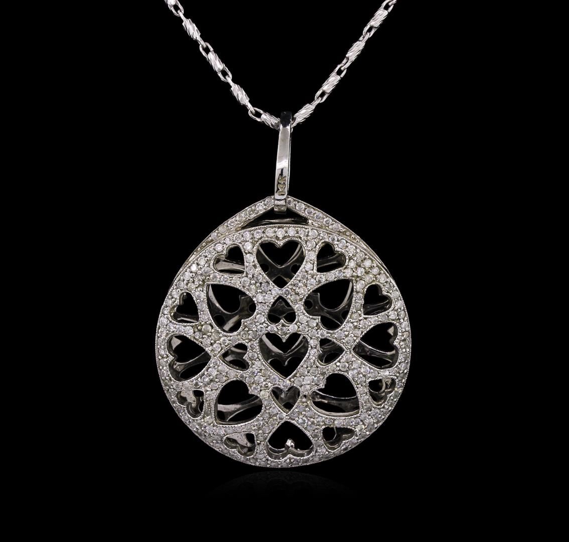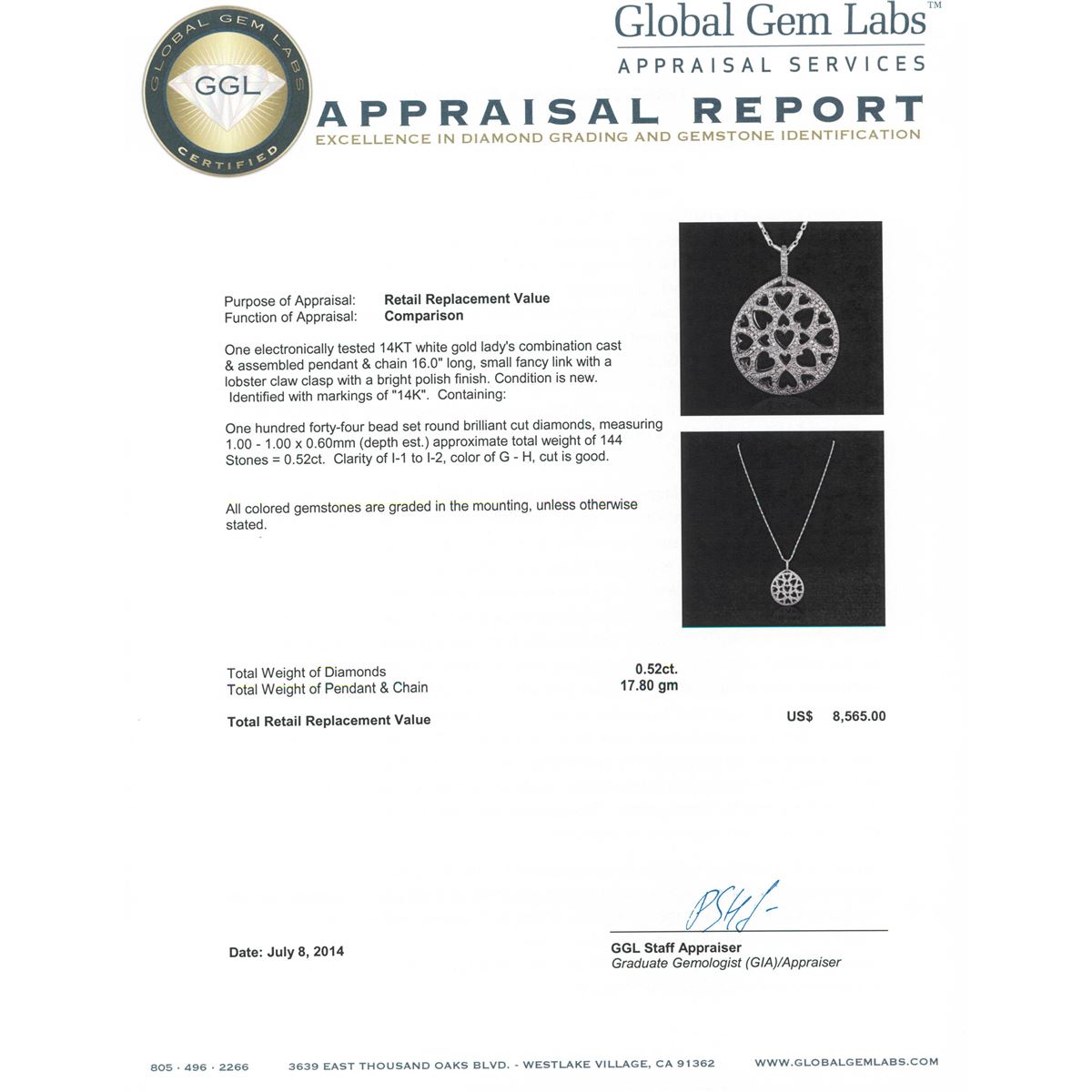 One electronically tested 14KT white gold Ladies combination cast & assembled pendant & chain 16.0" long, small fancy link with a lobster claw clasp with a bright polish finish. Condition is new. Identified with markings of "14K". Containing: One Hundred Forty-Four bead set round brilliant cut diamonds, measuring 1.00 - 1.00 x 0.60mm (depth est.) approximate. Total Weight of 144 Stones = 0.52ct. Clarity: I-1 to I-2. Color: G - H, Cut is Good. All colored gemstones are graded in the mounting, unless otherwise stated. Total Weight of Diamonds 0.52ct. Total Weight of Pendant & Chain 17.80 grams. GGL Appraised at $8,565.00.
