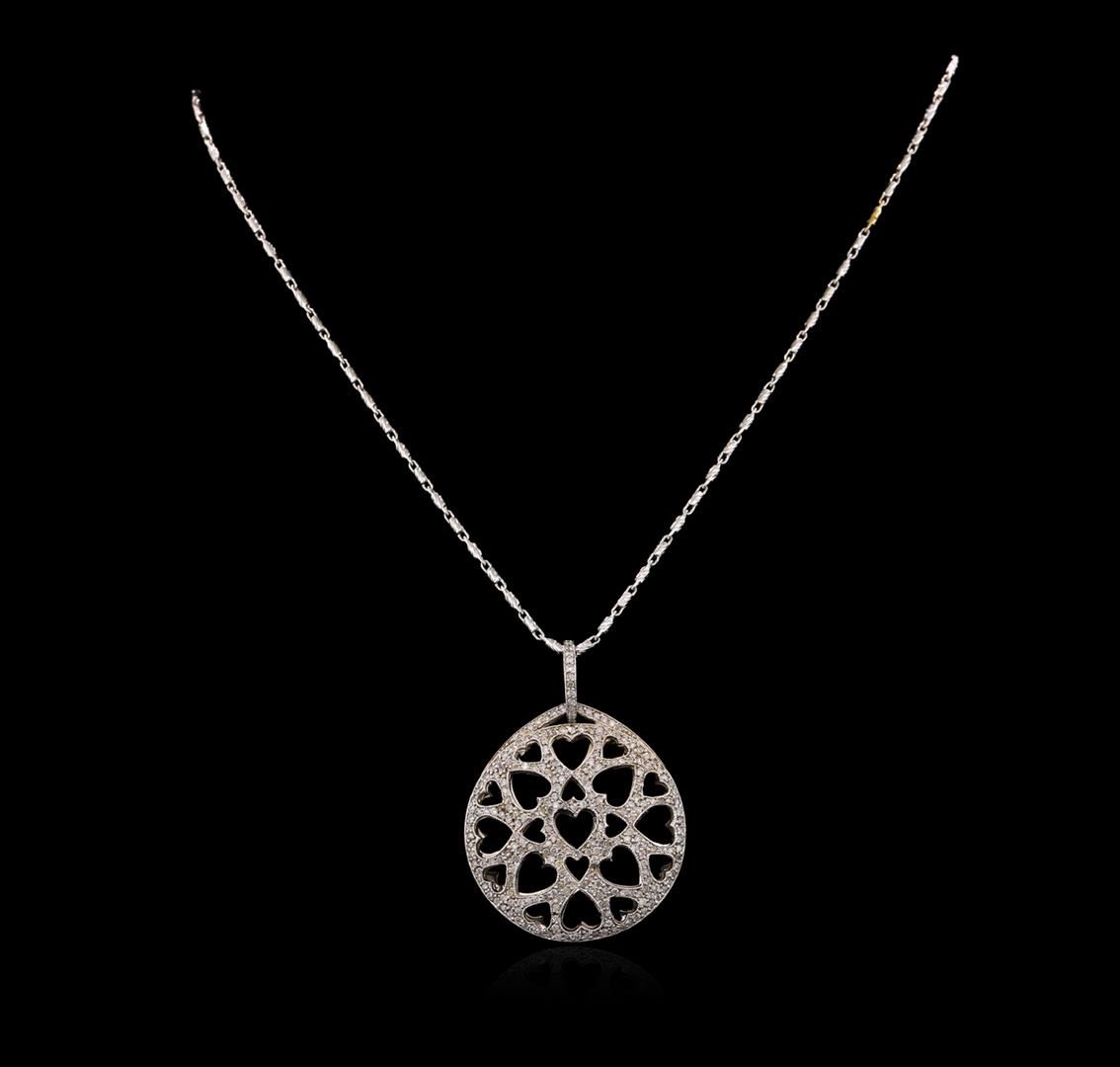 One electronically tested 14KT white gold Ladies combination cast & assembled pendant & chain 16.0" long, small fancy link with a lobster claw clasp with a bright polish finish. Condition is new. Identified with markings of "14K". Containing: One Hundred Forty-Four bead set round brilliant cut diamonds, measuring 1.00 - 1.00 x 0.60mm (depth est.) approximate. Total Weight of 144 Stones = 0.52ct. Clarity: I-1 to I-2. Color: G - H, Cut is Good. All colored gemstones are graded in the mounting, unless otherwise stated. Total Weight of Diamonds 0.52ct. Total Weight of Pendant & Chain 17.80 grams. GGL Appraised at $8,565.00.