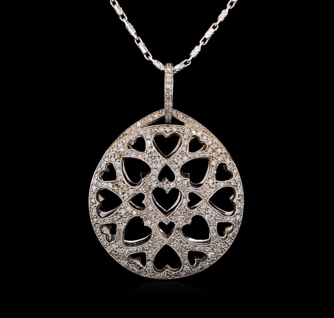 One electronically tested 14KT white gold Ladies combination cast & assembled pendant & chain 16.0" long, small fancy link with a lobster claw clasp with a bright polish finish. Condition is new. Identified with markings of "14K". Containing: One Hundred Forty-Four bead set round brilliant cut diamonds, measuring 1.00 - 1.00 x 0.60mm (depth est.) approximate. Total Weight of 144 Stones = 0.52ct. Clarity: I-1 to I-2. Color: G - H, Cut is Good. All colored gemstones are graded in the mounting, unless otherwise stated. Total Weight of Diamonds 0.52ct. Total Weight of Pendant & Chain 17.80 grams. GGL Appraised.