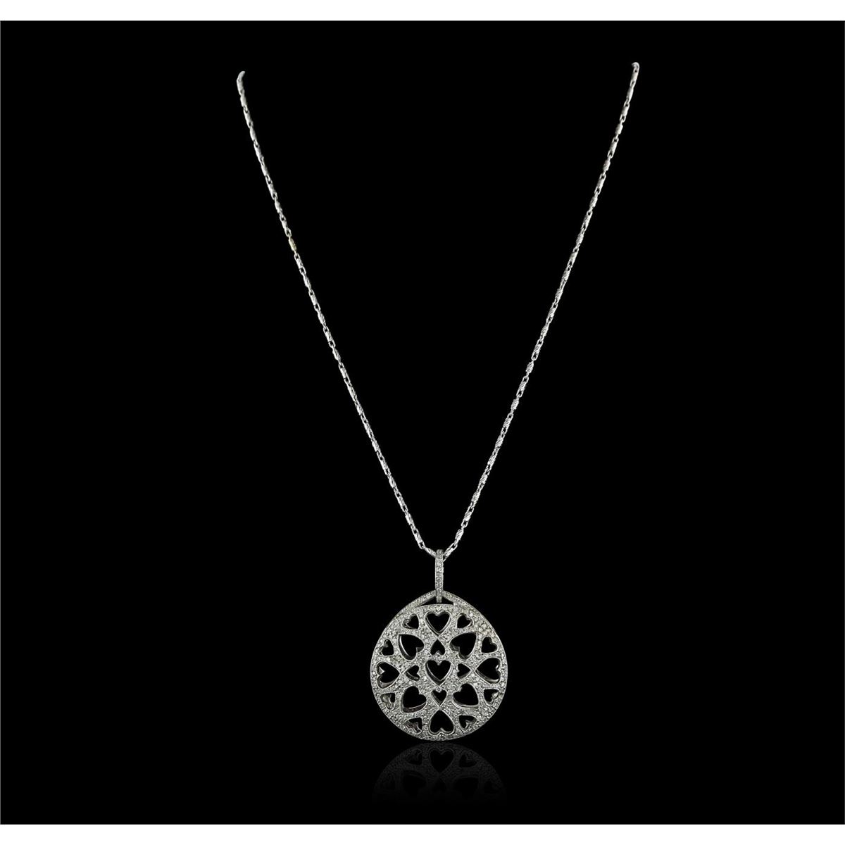 One electronically tested 14KT white gold Ladies combination cast & assembled pendant & chain 16.0" long, small fancy link with a lobster claw clasp with a bright polish finish. Condition is new. Identified with markings of "14K". Containing: One Hundred Forty-Four bead set round brilliant cut diamonds, measuring 1.00 - 1.00 x 0.60mm (depth est.) approximate. Total Weight of 144 Stones = 0.52ct. Clarity: I-1 to I-2. Color: G - H, Cut is Good. All colored gemstones are graded in the mounting, unless otherwise stated. Total Weight of Diamonds 0.52ct. Total Weight of Pendant & Chain 17.80 grams. GGL Appraised at $8,565.00.