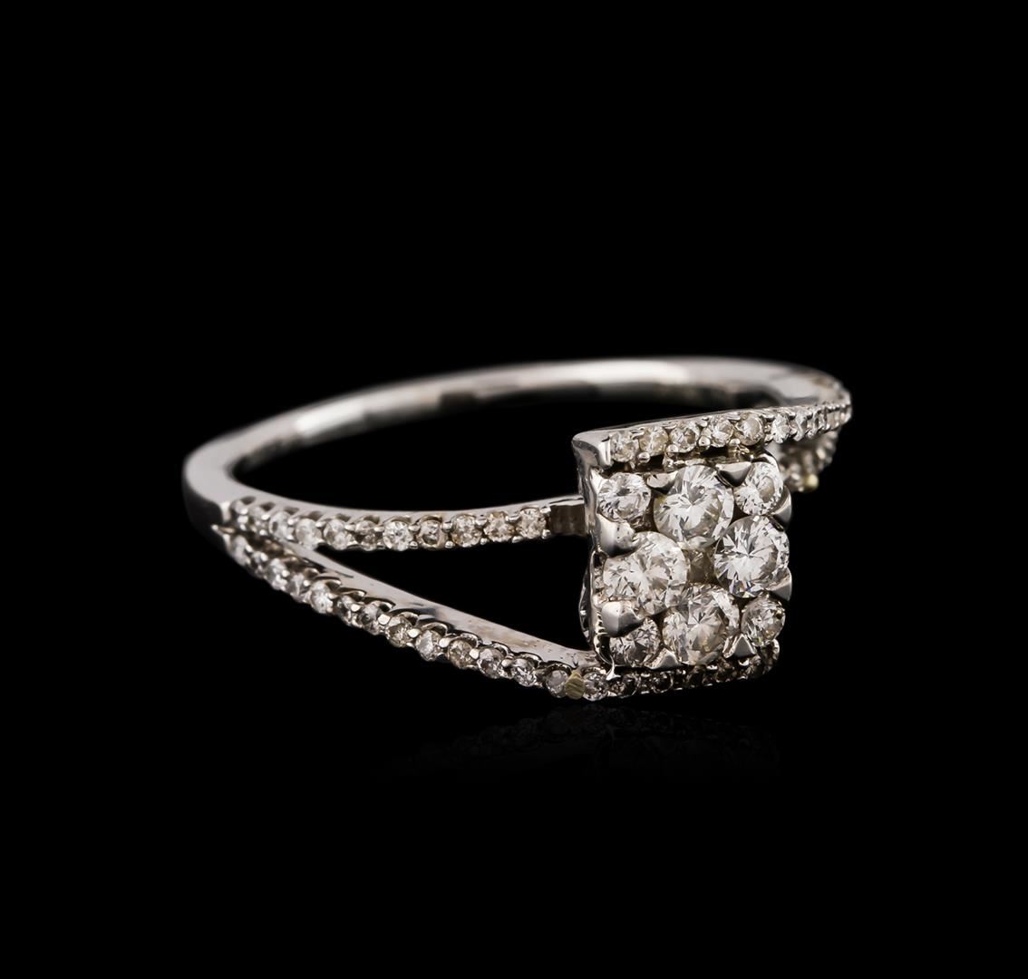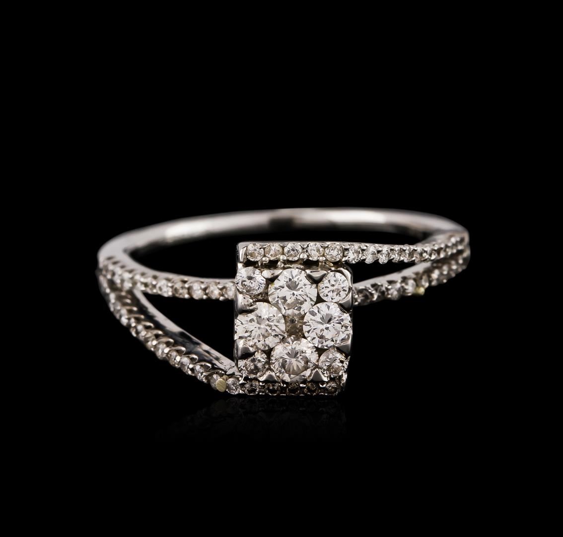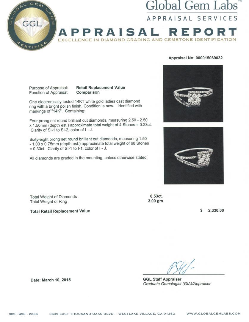 One electronically tested 14KT white gold ladies cast diamond ring with a bright polish finish. Identified with markings of "14K". Condition is new. Containing: Four prong set round brilliant cut diamonds, measuring 2.50 - 2.50 x 1.50mm (depth est.) approximate total weight of 4 Stones = 0.23ct. Clarity: SI-1 to SI-2. Color: I - J. Sixty-Eight prong set round brilliant cut diamonds, measuring 1.50 - 1.00 x 0.75mm (depth est.) approximate total weight of 68 Stones = 0.30ct. Clarity: SI-1 to I-1. Color: I - J. All diamonds are graded in the mounting, unless otherwise stated. Total Weight of Diamonds 0.53ct. Total Weight of Ring 3.00 grams. GGL Appraised at $2,330.00.