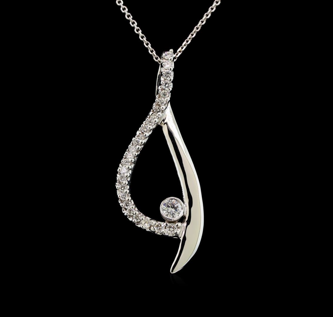 One electronically tested 14KT white gold ladies cast diamond pendant & chain 18.0" long, with a spring ring clasp with a bright polish finish. Identified with markings of "14K". Condition is new. Containing: One bezel set round brilliant cut diamond, measuring 4.00 - 4.00 x 2.40mm (depth est.) approximate weight of 0.23ct. Clarity: SI-2. Color: I, Cut is Good. Twenty-Five prong set round brilliant cut diamonds, measuring 1.50 - 1.50 x 0.90mm (depth est.) approximate total weight of 25 Stones = 0.31ct. Clarity: SI-1 to I-1. Color: I - J, Cut is Good. All diamonds are graded in the mounting, unless otherwise stated. Total Weight of Diamonds 0.54ct. Total Weight of Pendant & Chain 6.60 grams. GGL Appraised at $2,795.00.