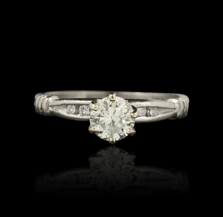 14KT White Gold 0.76ct Diamond Ring A4759 .Great Condition! YH357FB. One electronically tested platinum ladies cast & assembled diamond unity ring with a bright polish finish. Condition is good. The featured diamond is set within a 14KT white gold basket supported by diamond set shoulders, completed by a one and one-half millimeter wide band. Identified with markings of "PLAT". Containing: One prong set round brilliant cut diamonds, measuring 5.60 - 5.50 x 3.70mm (depth est.), 5.00%GTCF approximate weight of 0.76ct with a faint blue fluorescence. Graded in the setting. Clarity SI-2. Color M. Depth 66.7%. Table 61.3%. Four channel set round brilliant cut diamonds, measuring 1.90 - 1.70 x 1.08mm (depth est.) approximate total weight of 4 stones = 0.10ct. Graded in the setting. Clarity SI-1 to SI-2. Color H-I. Total weight of Diamonds 0.86ct. Total weight of Ring 3.75gm. AIG Appraised at $7,090.00.
