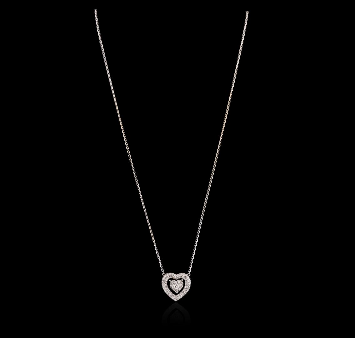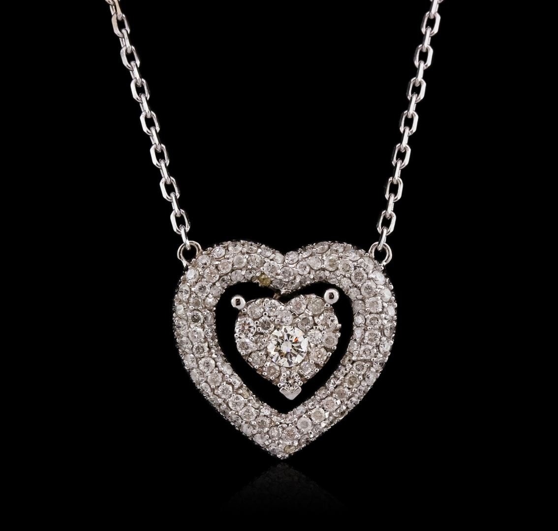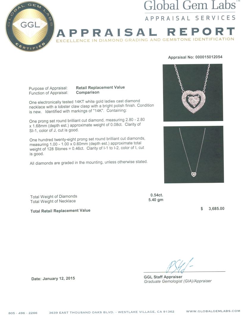 One electronically tested 14KT white gold ladies cast diamond necklace with a lobster claw clasp with a bright polish finish. Identified with markings of "14K". Condition is new. Containing: One prong set round brilliant cut diamond, measuring 2.80 - 2.80 x 1.68mm (depth est.) approximate weight of 0.08ct. Clarity: SI-1. Color: J, Cut is Good. One Hundred Twenty-Eight prong set round brilliant cut diamonds, measuring 1.00 - 1.00 x 0.60mm (depth est.) approximate total weight of 128 Stones = 0.46ct. Clarity: I-1 to I-2. Color: I, Cut is Good. All diamonds are graded in the mounting, unless otherwise stated. Total Weight of Diamonds 0.54ct. Total Weight of Necklace 5.40 grams. GGL Appraised at $3,685.00.