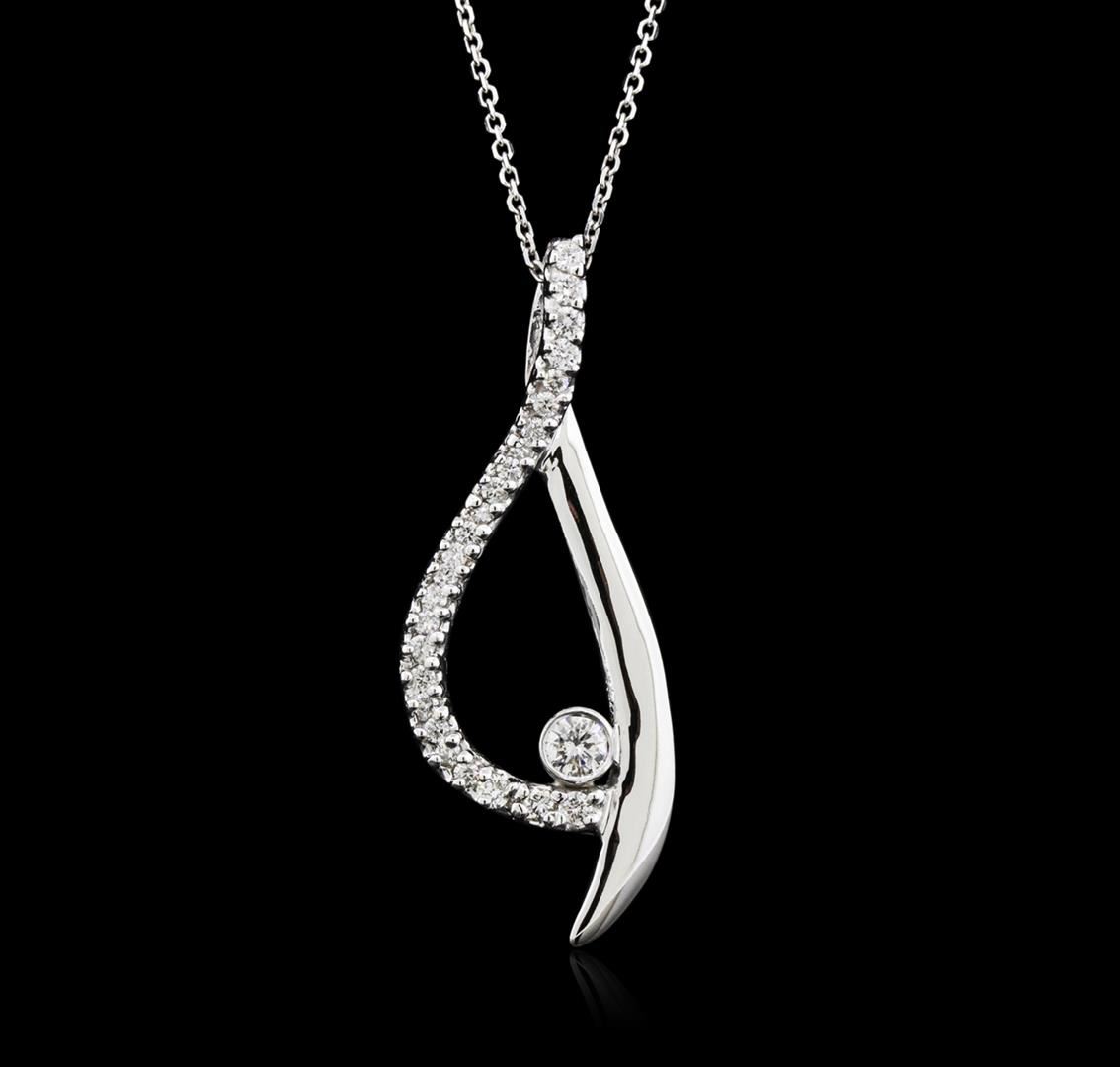 One electronically tested 14KT white gold ladies cast diamond pendant & chain 18.0" long, with a spring ring clasp with a bright polish finish. Identified with markings of "14K". Condition is new. Containing: One bezel set round brilliant cut diamond, measuring 4.00 - 4.00 x 2.40mm (depth est.) approximate weight of 0.23ct. Clarity: SI-2. Color: I, Cut is Good. Twenty-Five prong set round brilliant cut diamonds, measuring 1.50 - 1.50 x 0.90mm (depth est.) approximate total weight of 25 Stones = 0.31ct. Clarity: SI-1 to I-1. Color: I - J, Cut is Good. All diamonds are graded in the mounting, unless otherwise stated. Total Weight of Diamonds 0.54ct. Total Weight of Pendant & Chain 6.60 grams. GGL Appraised at $2,795.00.
