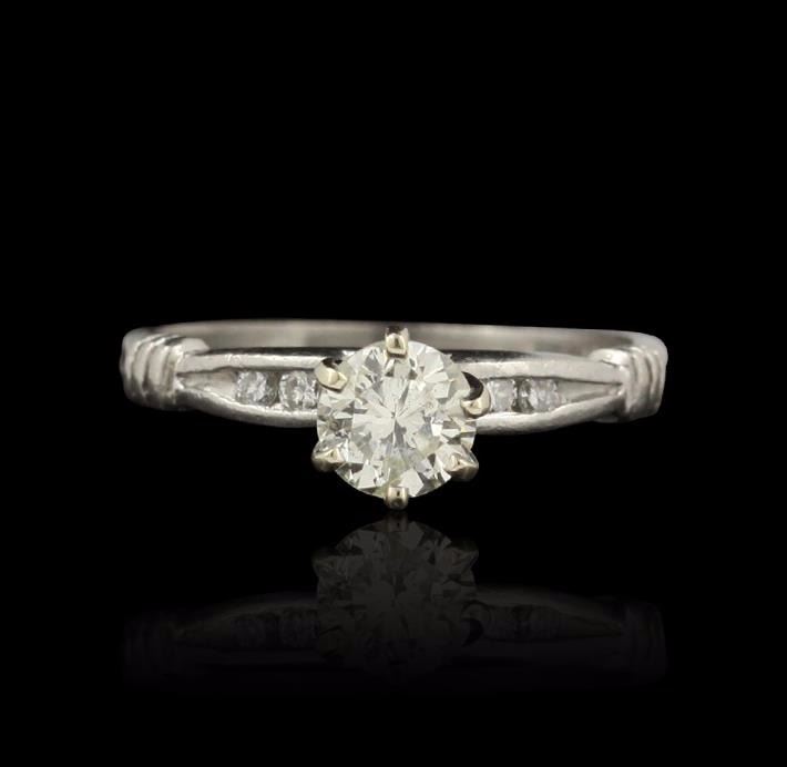 14KT White Gold 0.54ct Diamond Ring A4758 . One electronically tested 14KT white gold ladies cast diamond ring with a bright polish finish. Condition is good. The ring features a tapering seven diamond ribbon, completed by a two millimeter wide band. Identified with markings of "14K". Containing: One prong set round brilliant cut diamond, measuring 3.40 -- 3.40 x 2.04mm (depth est.) approximate weight of 0.15ct. Graded in the setting. Clarity I-1. Color G. Six prong set round brilliant cut diamonds, measuring 2.70 -- 2.50 x 1.56mm (depth est.) approximate weight of 6 stones = 0.39ct. Graded in the setting. Clarity I-1. Color G-H. Total weight of Diamonds 0.54ct. Total weight of Ring 3.11gm. Total AIG Appraised at $2,290.00.