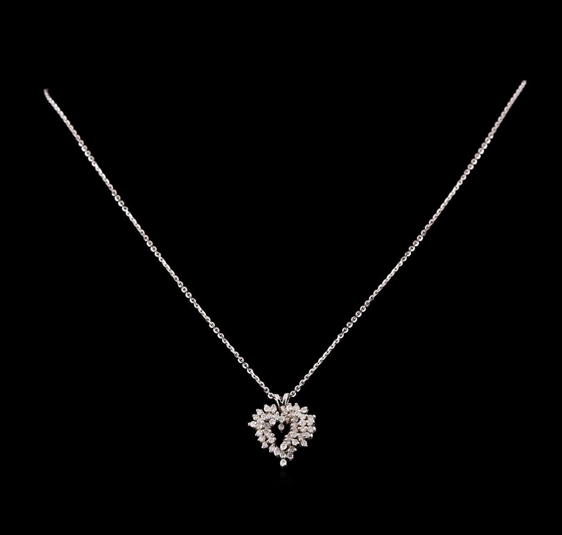 One electronically tested 14KT white gold ladies combination cast & assembled diamond pendant & chain 18.0" long, cable link with a lobster claw clasp with a bright polish finish. Identified with markings of "14K". Condition is new. Containing: Forty-Five prong set round brilliant cut diamonds, measuring 1.50 - 1.50 x 0.90mm (depth est.) approximate total weight of 45 Stones = 0.55ct. Clarity: I-1 to I-2. Color: I - J, Cut is Good. All diamonds are graded in the mounting, unless otherwise stated. Total Weight of Diamonds 0.55ct. Total Weight of Pendant & Chain 6.10 grams. GGL Appraised at $3,295.00.