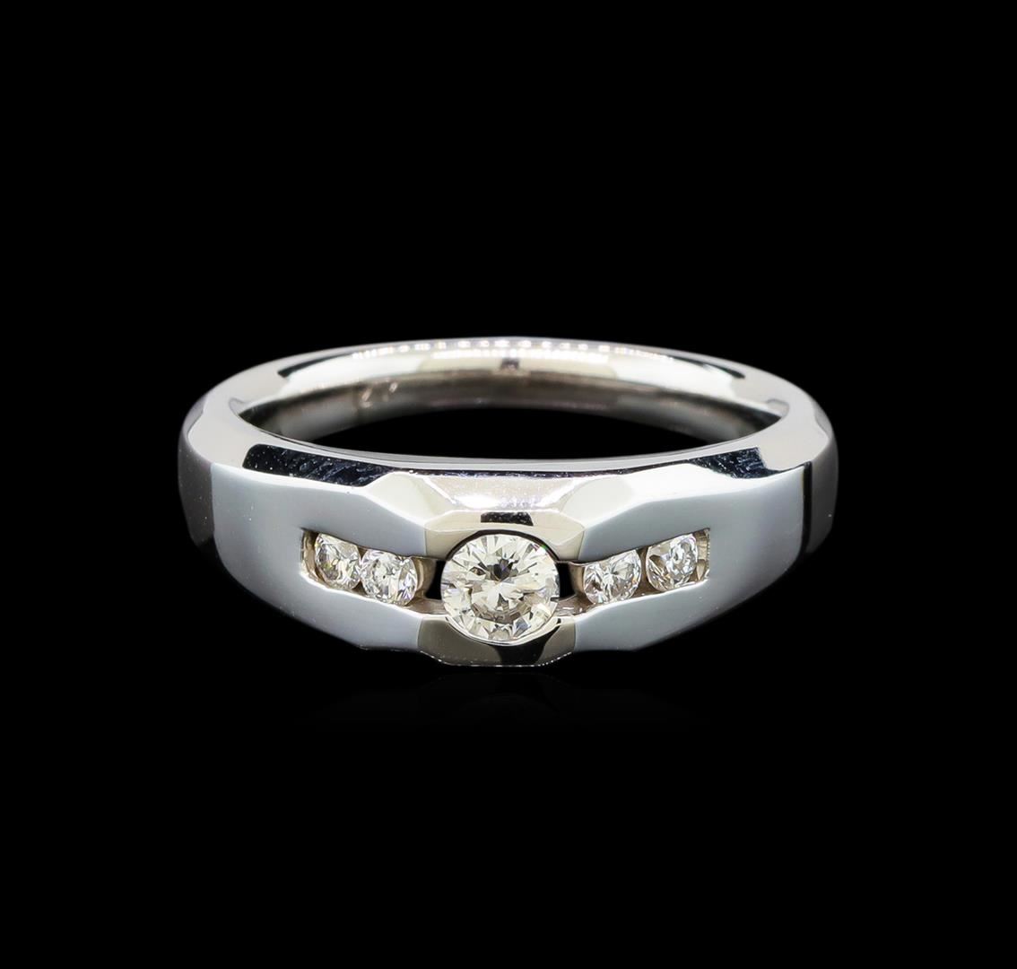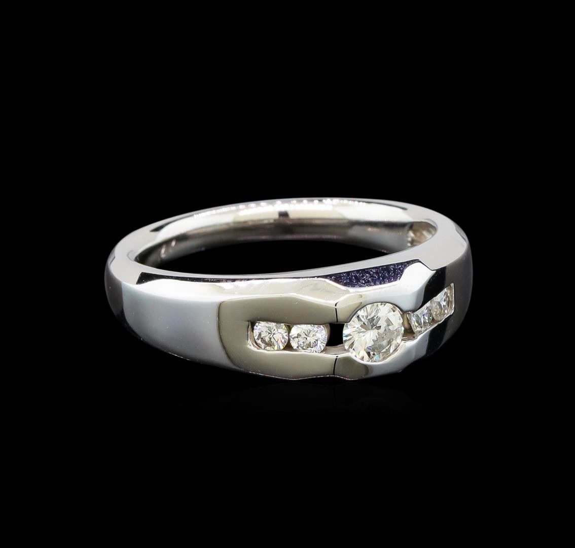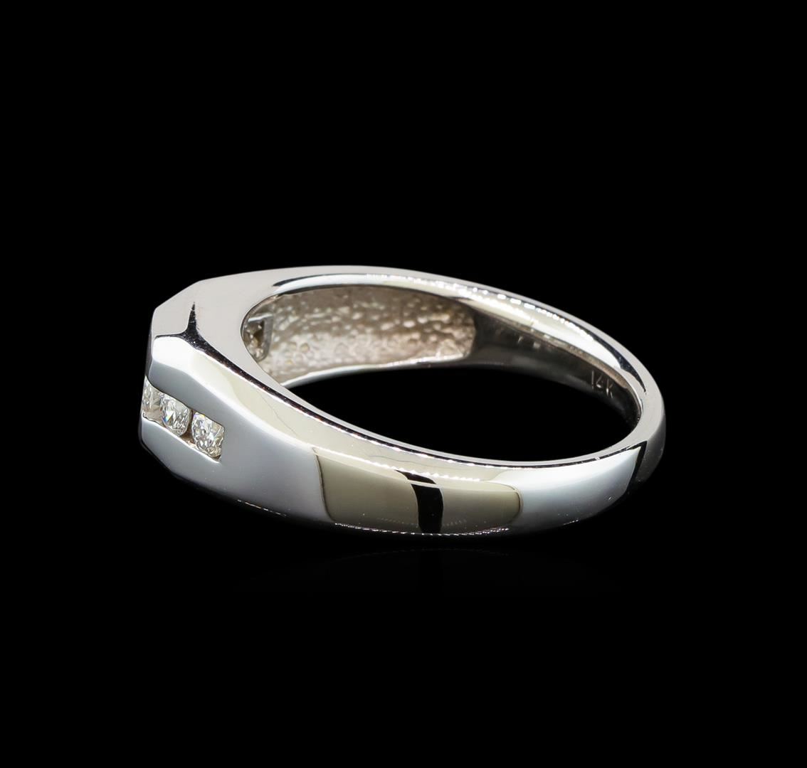 One electronically tested 14KT white gold gents cast diamond ring with a bright polish finish. The featured diamond is supported by diamond set shoulders, completed by a two and one-half millimeter wide band. Identified with markings of "14K". Condition is new, good workmanship. Containing: One channel set round brilliant cut diamond, measuring 4.41 - 4.40 x 2.20mm (depth est.) approximate weight of 0.30ct with a medium strong blue fluorescence. Graded in the setting. Clarity: I-1. Color: H. Depth 49.9%. Table 61.2%. Four channel set round brilliant cut diamonds, measuring 2.40 - 2.30 x 1.41mm (depth est.) approximate total weight of 4 Stones = 0.25ct. Graded in the setting. Clarity: SI-2 to I-1. Color: G - H. Total Weight of Diamonds 0.55ct. Total Weight of Ring 7.62 grams. AIG Appraised at $3,080.00.