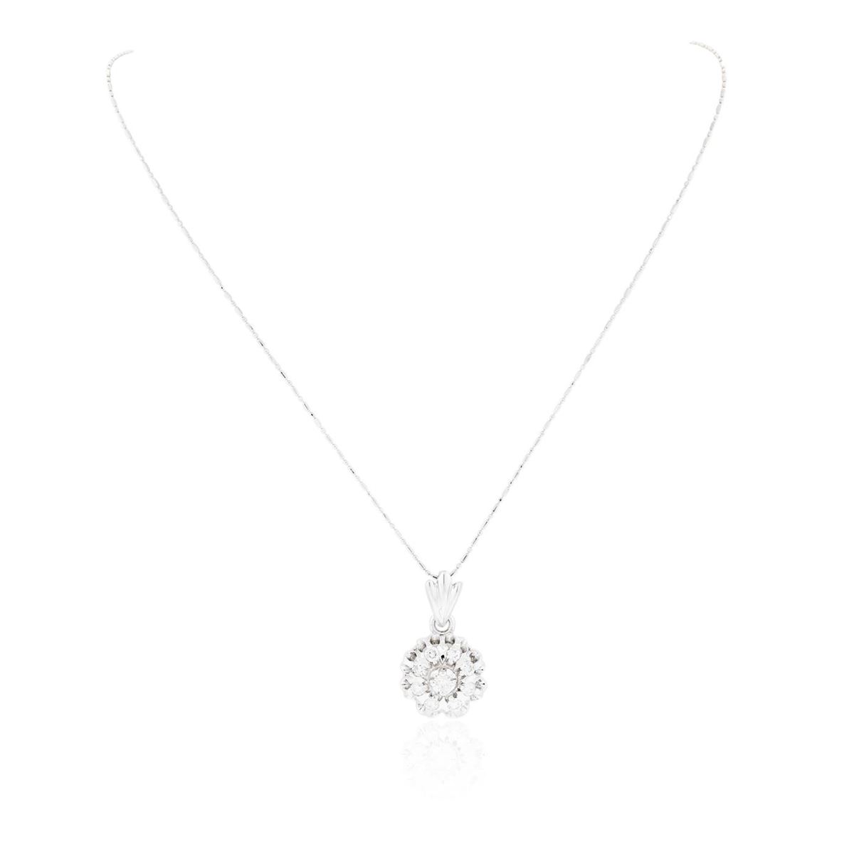One electronically tested 14KT white gold ladies cast diamond pendant & chain 16.0" long, fancy link with a lobster claw clasp with a bright polish finish. Identified with markings of "14K". Condition is new. Containing: Nine prong set round brilliant cut diamonds, measuring 3.00 - 2.50 x 1.65mm (depth est.) approximate total weight of 9 Stones = 0.55ct. Clarity: SI-2 to I-1. Color: I - J, Cut is Good. All diamonds are graded in the mounting, unless otherwise stated. Total Weight of Diamonds 0.55ct. Total Weight of Pendant & Chain 6.60 grams. GGL Appraised at $3,595.00.